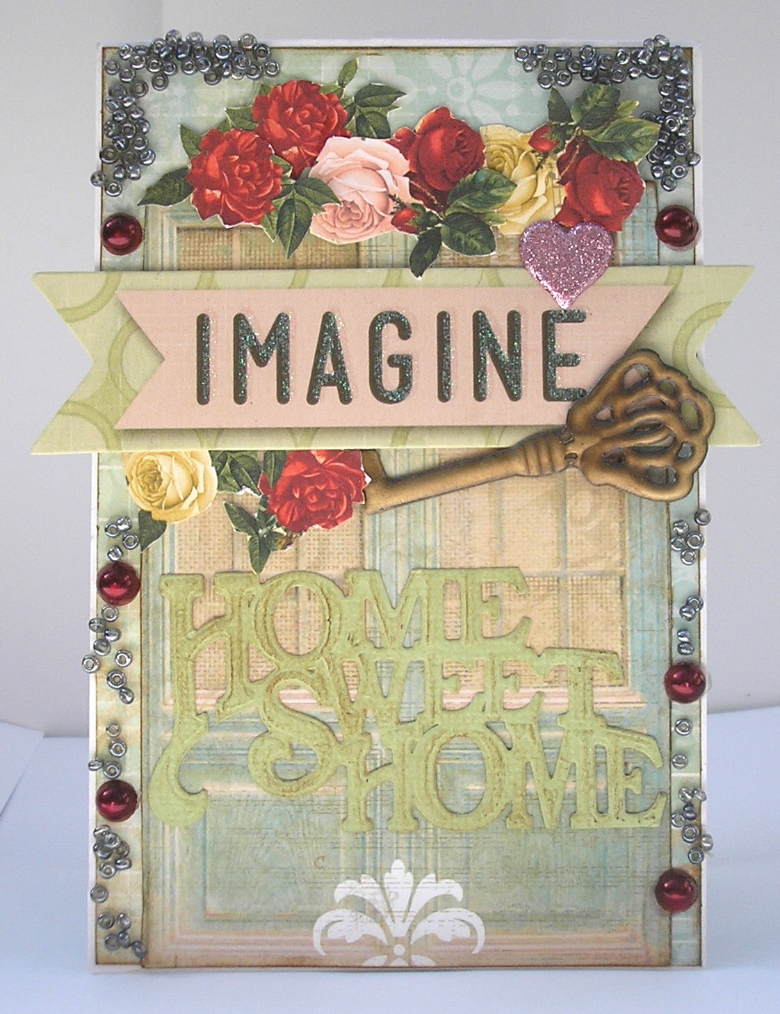 Quick Guide: Cut a piece of 10.4" x 3.4" plain white card into a card size 5.2" x 3.4" with the fold at the top. Cut two pieces of Bo Bunny Soiree Paper Linens (reverse side used) into size 5.1" x 3.2", ink edges with brown distress ink then glue one onto the front of the card and the other to the inside of the card. Cut a door panel from Bo Bunny The Avenues Paper, ink edges and stick to the front. Add some Glossy accents to two top corners and here and there on the edges and sprinkle with glass beads, press them down (see picture below) Cut out several roses from the Bo Bunny Juliet paper Soulmates and stick on the top of the door. Add pearls, a heart brad, a key and a sentiment. I used a die-cut for my sentiment here.