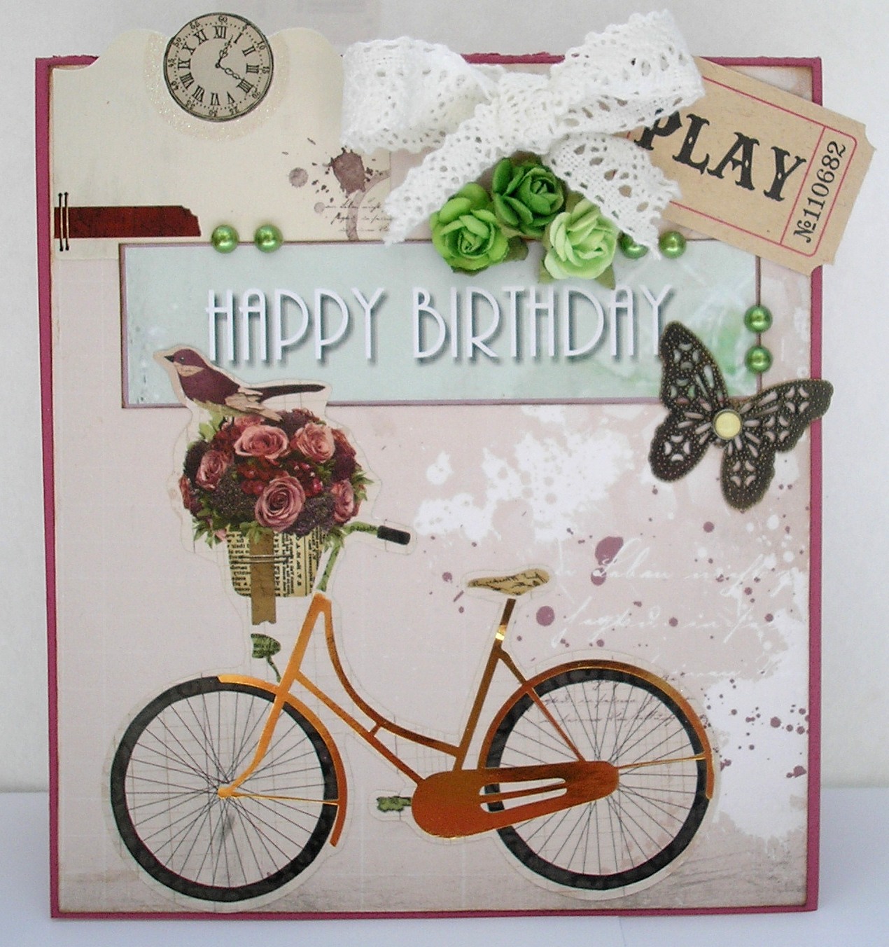 Opulently golden shimmer. Quick guide: Cut a 12" x 5.5" dusky pink piece of cardstock into a card size 6" x 5.5". Cut two pieces of Bo Bunny Beautiful Dreamer Paper Imagine (reverse side used here) slightly smaller than the card to show a margin as shown, ink edges then stick one to the front of the card, and one to the inside - I always decorate the inside too, it makes a huge difference to the look and feel of the card. Add the clock die-cut from the Noteworthy pack. Print out the "Happy Birthday" sign that I am givng you below at the size you want. Mine is 11cm x 3cm. You can insert the image into a Word document and resize it and print it from there. Stick onto front of card. Add the beautiful golden bicycle noteworthy die-cut, then the other embellishments as shown.