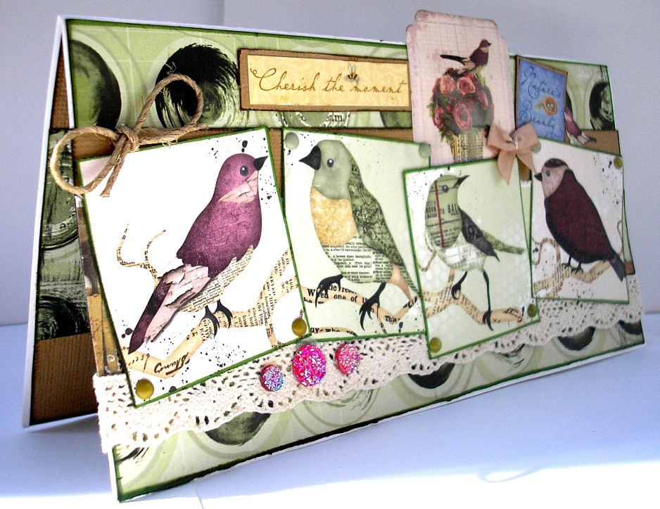 This is a larger card, measuring 8" x 4". I created a beautiful middle section then proceed to cover it all with the four birds LOL The birds are from one of the sheets. The flowers with the bird on top is a noteworthy from the collection and I cut the little bird out from one of the sheets too.