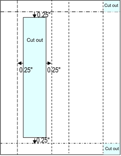 Cut out a rectangle as shown below, leaving a 0.25" inch margin all around; this is our window that will show the candles. Cut out the two corners as shown in blue below: