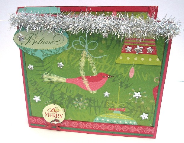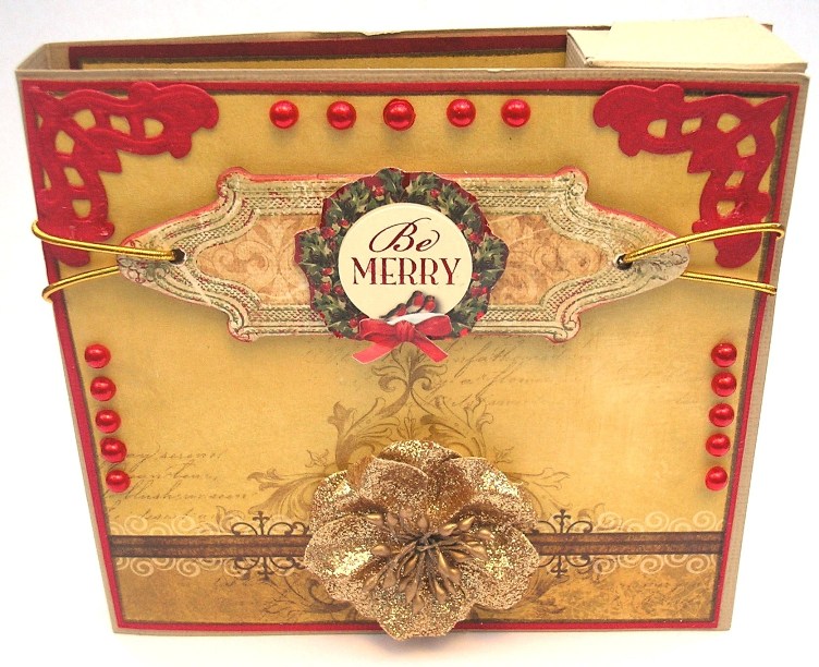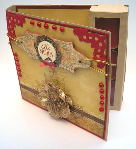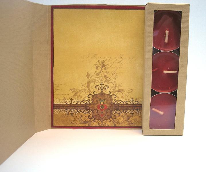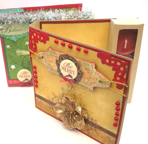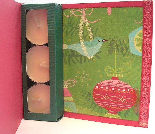 This card is a great idea for Christmas, with a little present within a card. You can vary the contents by putting sweets in the box rather than scented candles.