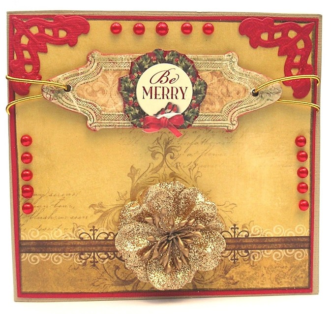 On this card I used the following supplies: Plain cardstock - Bo Bunny Silver & Gold 6x6 Paper Pad - Red Pearls - Prima Holiday Flower - K&Co Layered Accent - K&Co Chipboard - Gold Cord - Marianne Corner die - IKEA scented tea light candles