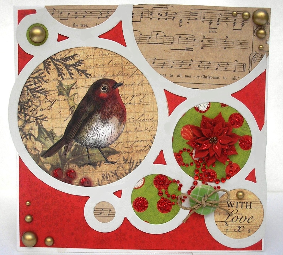 6" x 6" card. Musical notes "With Love" and Robin are all Craftwork Cards Die-cuts. Green paper with red dots is Bo Bunny and the main paper is Bo Bunny Merry & Bright "Magic".