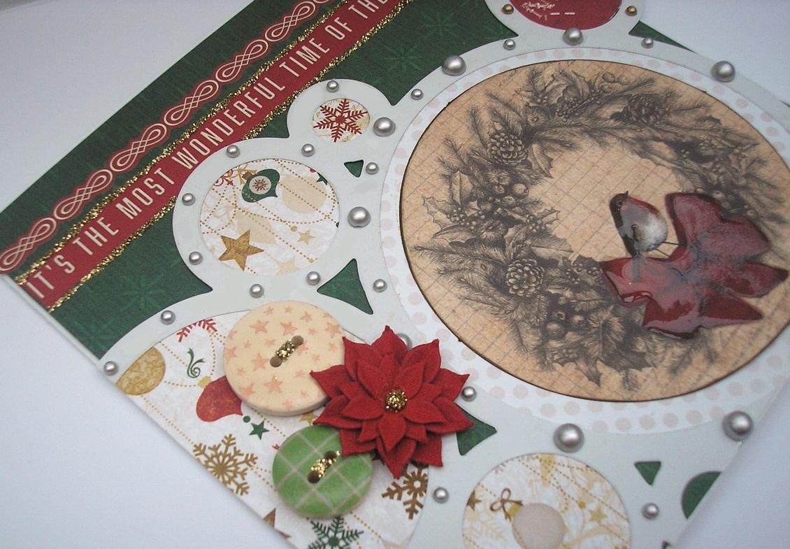 Craftwork Cards Christmas Die-Cuts Kaisercraft Party Time Die-Cut 12x12 Circle Paper Kaisercraft Silent Night Collection Dovecraft Gold Christmas Bow and Pearls Basic Grey Scrap paper