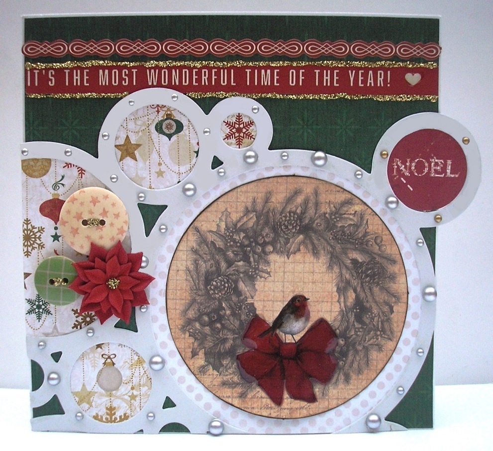 Craftwork Cards Christmas Die-Cuts Kaisercraft Party Time Die-Cut 12x12 Circle Paper Bo Bunny Merry & Bright paper "Magic" Dovecraft Dear Santa Button and Gold Pearls Bo Bunny Elf Magic Papers for some of the circles