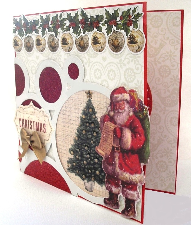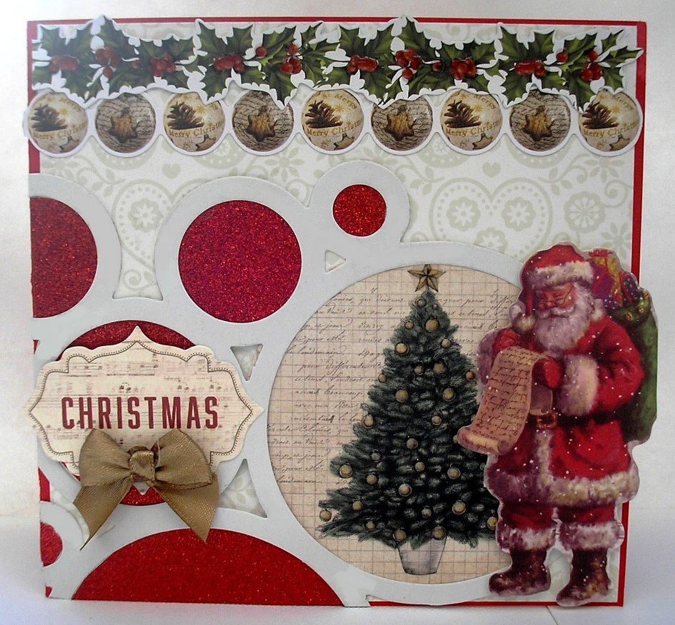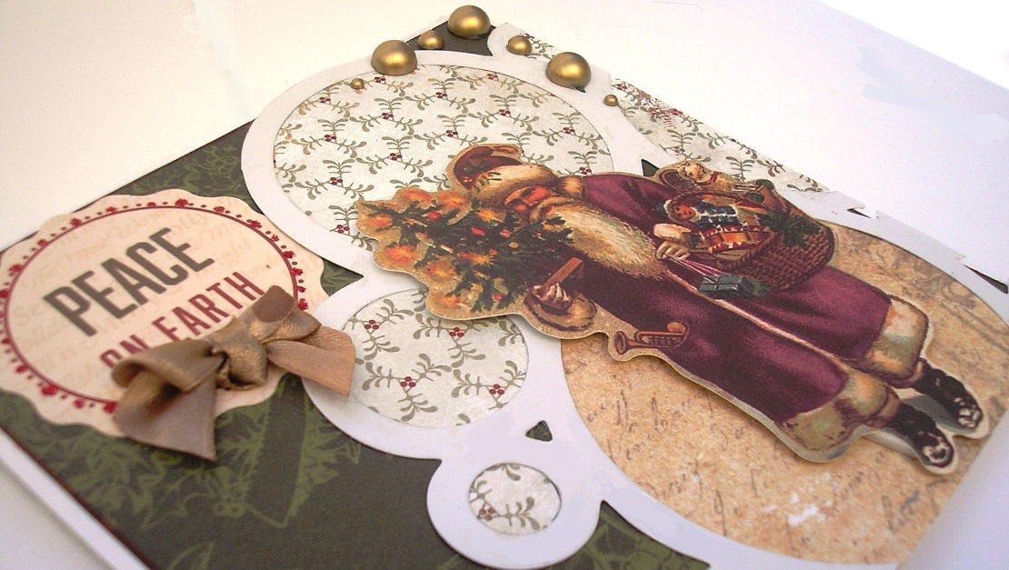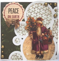 6" x 6" card covered with Kaisercraft Silent Night "Trim the Tree" . Santa is from the silent night collectables pack, as is "Peace on Earth".