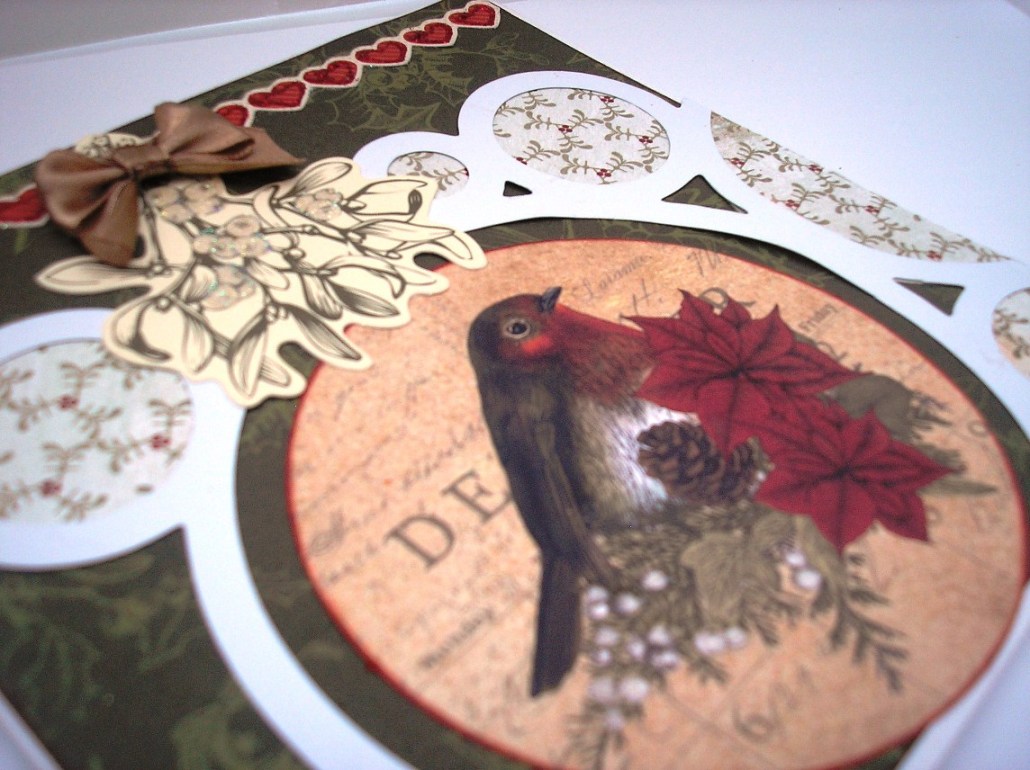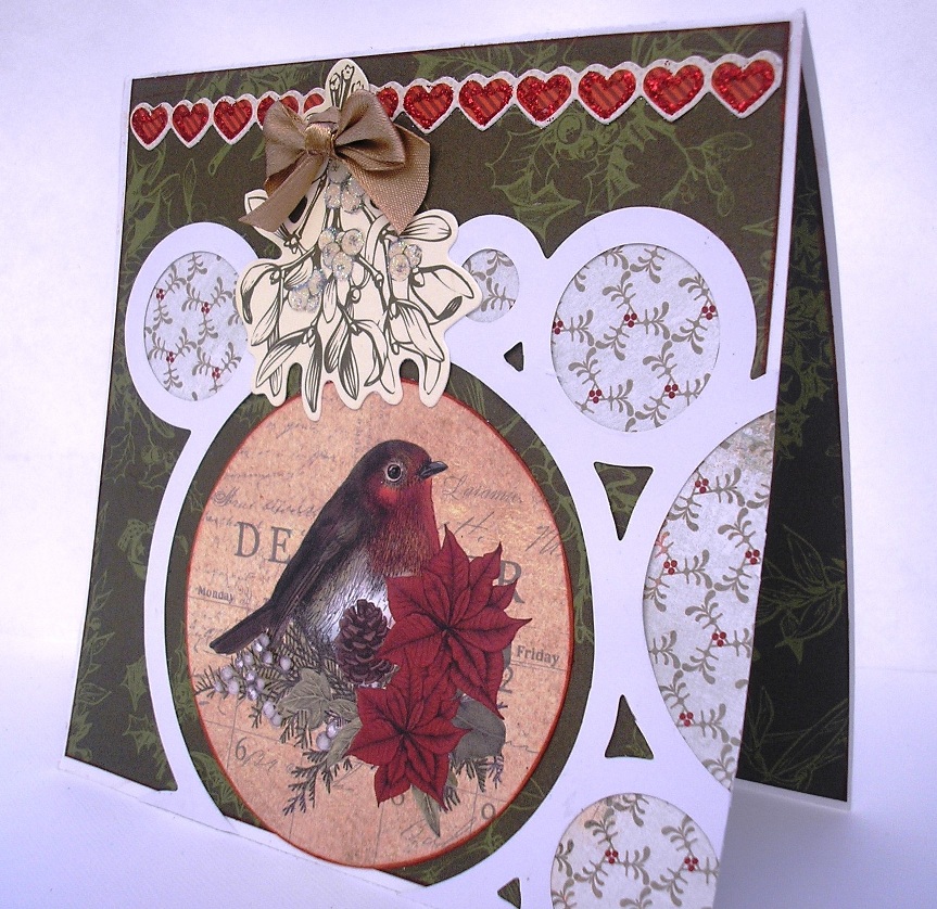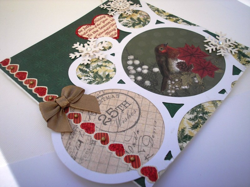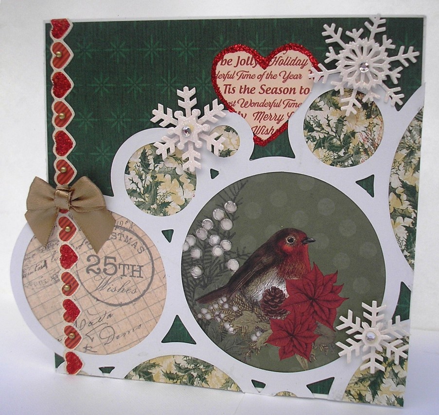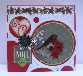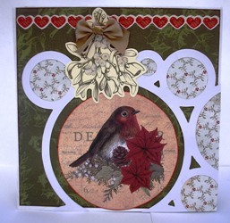 Another 6" x 6" card. Patterned paper is Kaisercraft Silent Night "Trim the Tree" Here I inked the edges of the robin die-cut the used it as it was inside the largest circle. Mistletoe die-cut is from the Silent Night Collectables pack. I used Glossy Accents on the berries then sprinkled with Crystal Glamour Dust and top the sprig with a gold bow.. Red Stickles was used the accentuate the heart border, which is from the Silent Night Sticker sheet. Glossy Accents were used on the berries by the Robin die-cut. The paper in the circles is from an old paper collection, these are a great way to use up your scraps.