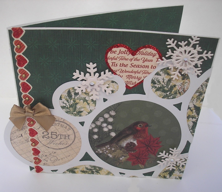 Most of the cards are size 6" x 6". The card is a 12" x 6" white piece of card or heavyweight paper, folded into a card size 6" x 6". I then cut two pieces of patterned paper slightly smaller so a white edge would show around the size and glue one to the front and one inside the card. I like decorating the inside to match the front and it always makes the card a luxurious weight. The background paper here is Kaisercraft Silent Night paper "Mistletoe"and the heart border is a sticker from the Silent Night 12x12 sticker sheet. I decorated the heart border with red Stickles and Gold Pearls. After deciding where I wanted the circles to go I glued patterned papers and die-cuts to the back, then glued them on and trimmed the edges. I decided to leave one complete. The centrepiece and the piece with "25th" on it are both Craftwork Cards Christmas Die-Cuts. I used Glossy Accents on the white berries and the little robin's eye. "Tis The Season" die-cut is from the Kaisercraft Silent Night Collectables pack, which I decorated with red Stickles. A little gold bow and some glittery snowflakes completed the front. s