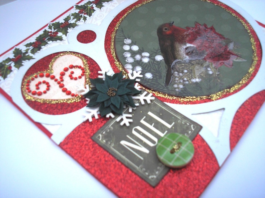 I folded a 12" x 6" piece of red cardstock into a card measuring 6" x 6" then covered with Bo Bunny Merry & Bright paper "Festive" On this card I decided to use a heavyweight red glitter card for inside the circles and I used the beautiful Kaisercraft Ruby Glitter Cardstock. The border is from the Kaisercraft Silent Night Sticker sheet. I wanted a gold border around the circle and heart so used Gold Stickles first then sprinkled with a fine gold glitter. Glossy Accents were used on the white berries and the poinsettia as well as the red berries in the top border.. The button had "thread" made from Gold Stickles. Noel and heart are both from the Kaisercraft Silent Night Collectables pack.
