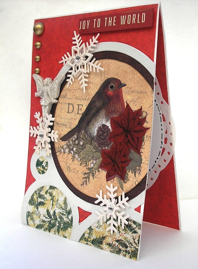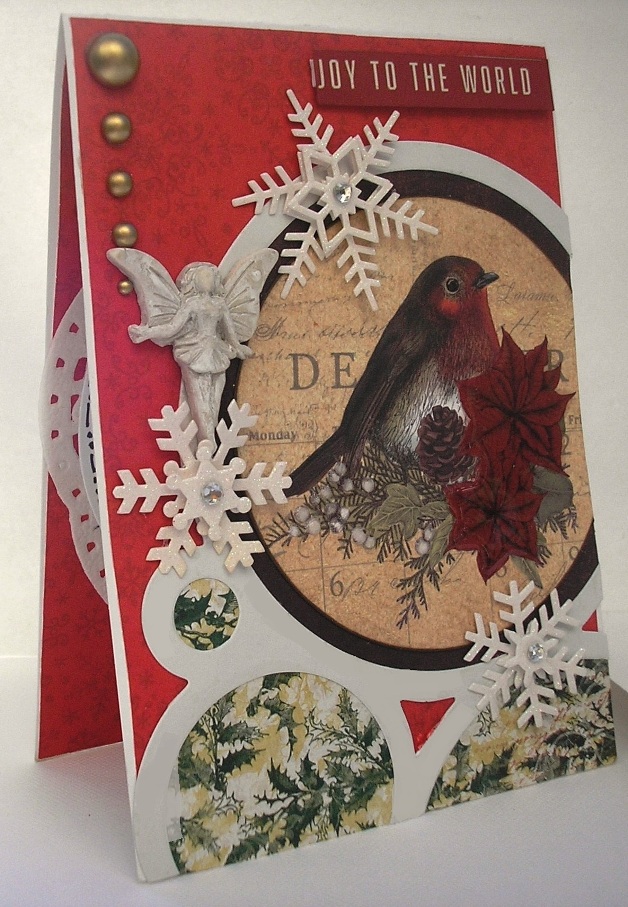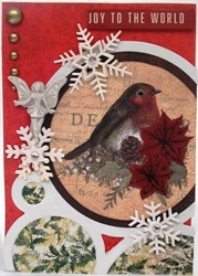 This a smaller card, measuring approximately 6" x 4.5". Again the same method was employed. I matted the robin die-cut on brown cardstock prior to gluing it on because it was too small for the circle. "Joy to the World" was on the edge of one of the papers I used, so make sure you check out the papers before you cut and throw and away. I mounted on red cardstock, then inked edges and adhered with foam tape to elevate it a bit.