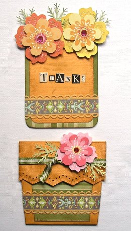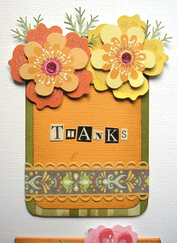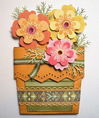 Divide them up between the insert and the pot. You can make your own flowers but I used the beautiful 3-dimensional flowers from K & Company Citronella collection here. Punch out some leaves and put them behind the flowers.