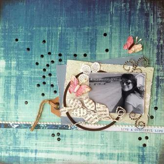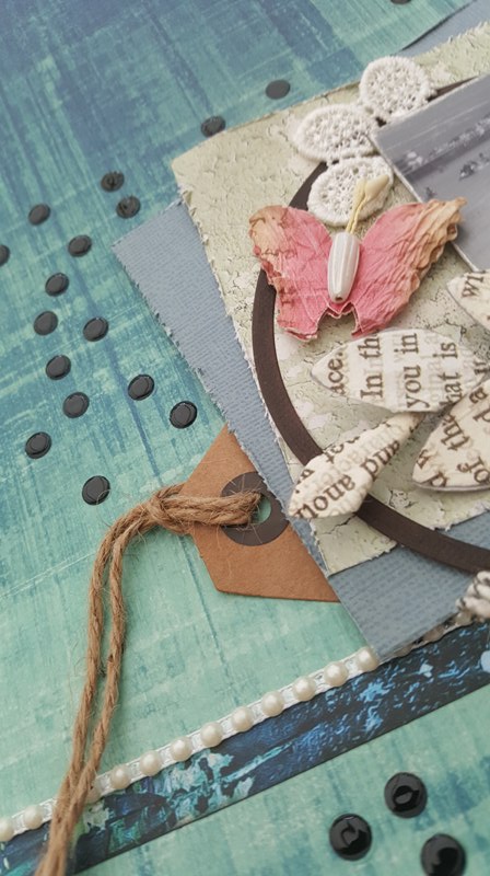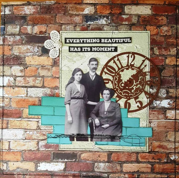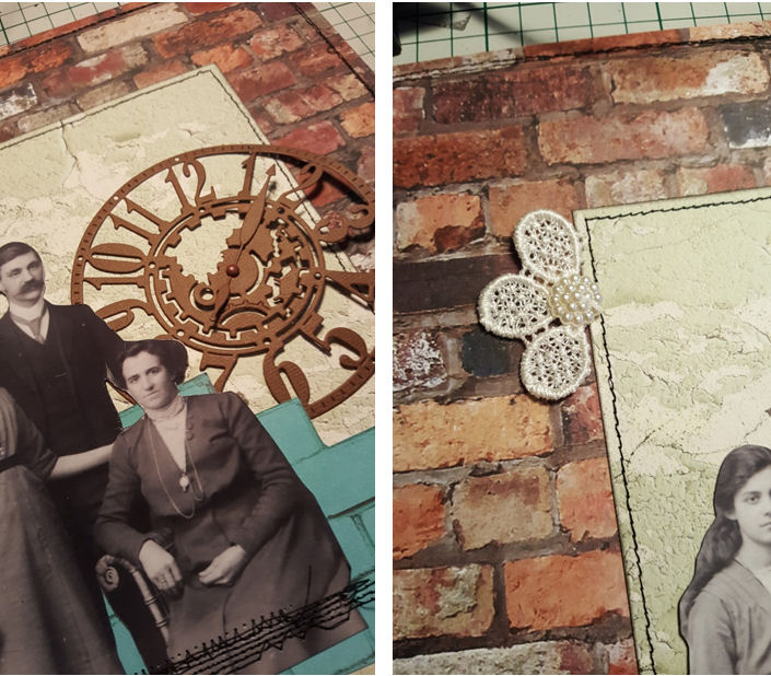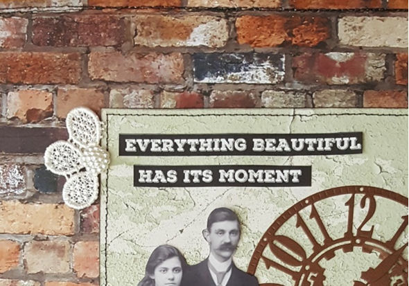 4. I added the die cut of the clock underneath the photo and added the second half of the Prima lace flower and the pearl button to the top left of the “Metal Panels” paper.