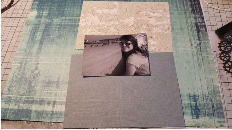 1. Distress the edge of your photo with a nail file, then mat it onto some of the “Pebble” paper.