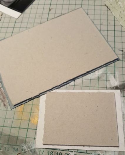 3. Glue some chipboard off-cuts to the back of your photo (not included in kit) and several of the “Derelict” pieces to give them some depth. Then layer them up and glue on top of each other ending with the matted photo.