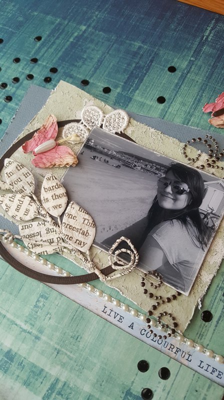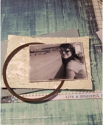 5. Add various embellishments – cut the Prima lace flower in half and slip under the top left corner of your photo.