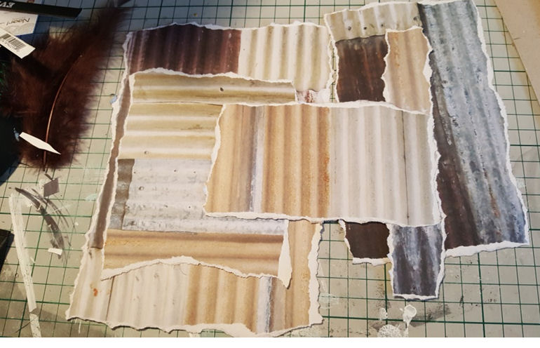 2. Tear your “Derelict” paper into five pieces of differing sizes. If you tear the paper towards you on the side you want to use you will find it leaves you with the white inside of the paper showing which can be a very nice effect.