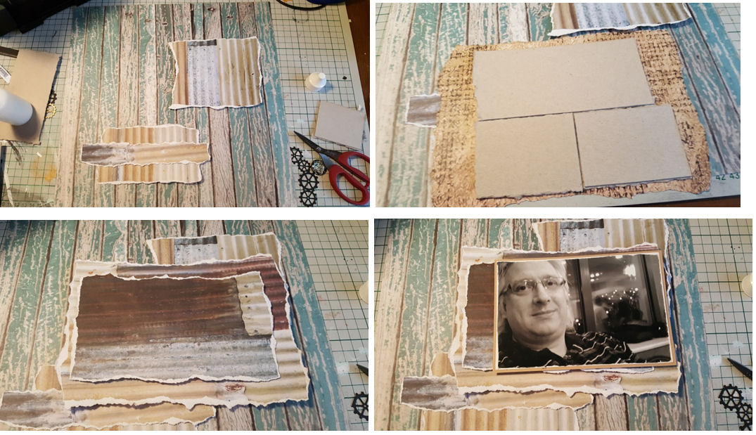 3. Glue some chipboard off cuts to the back of your photo and the “Metal Panels” paper to give them some depth.