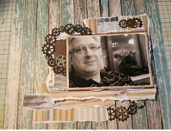 I cut about a quarter of the cogs die cut away and put the larger piece at the top left hand side of my photo. I added the smaller off-cut to the bottom right.