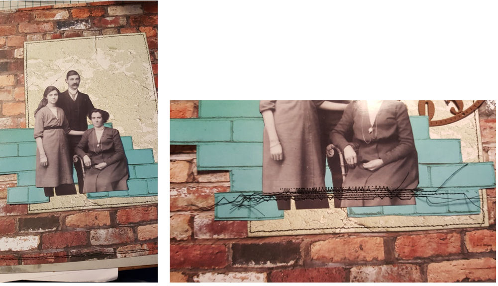 3. Cut out some of the bricks on the back of the “Abstract Art” paper. I also cut around the family shot of my grandmother and her parents. I adhered these to the backing papers and then used my sewing machine to make lines of stitches to “ground” my photo.