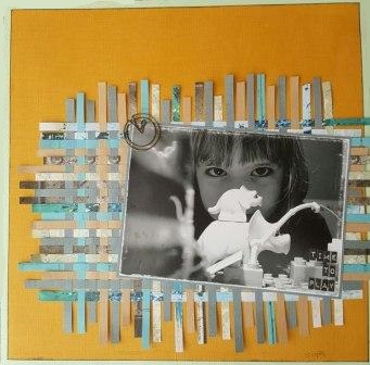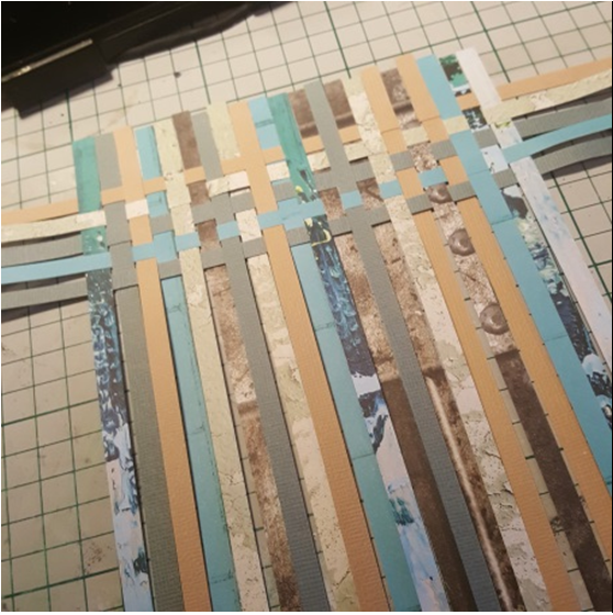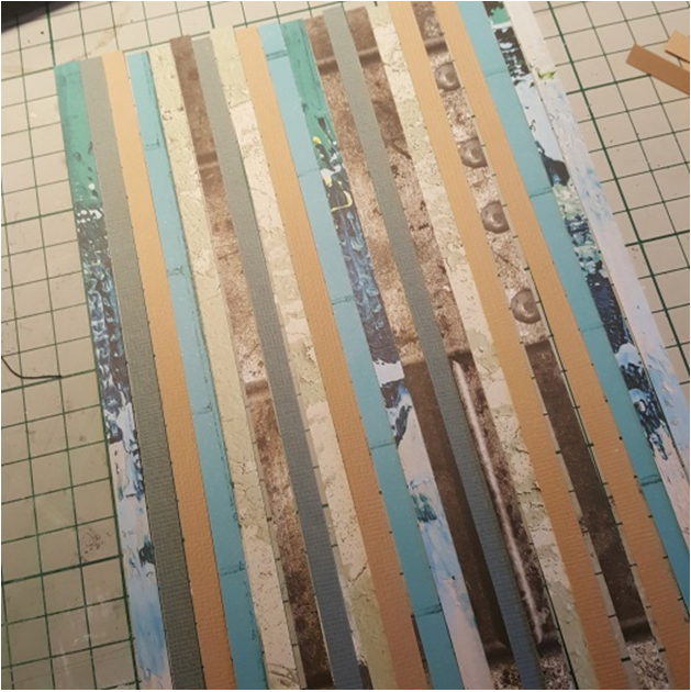 1. Cut lots of 0.25 inch wide strips of the patterned paper and the “Elephant Ears” and “Pebble” cardstock. Lay about 22 strips down side by side as in the photo. I found it helpful to adhere them to my mat with some double sided sticky tape at the very top.
