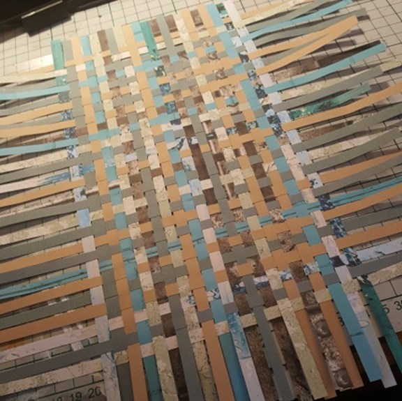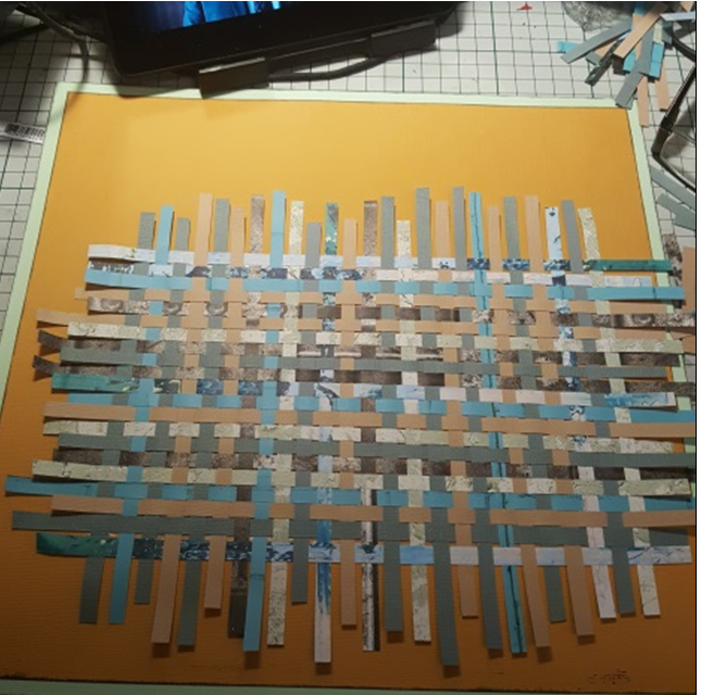 3. Do this with all your paper and until you have a large area of woven paper. Gently remove from the double sided sticky tap and carefully trim the outside edges of the weave. I found it was helpful to secure the weave with double sided sticky tape on the reverse side prior to trimming. .