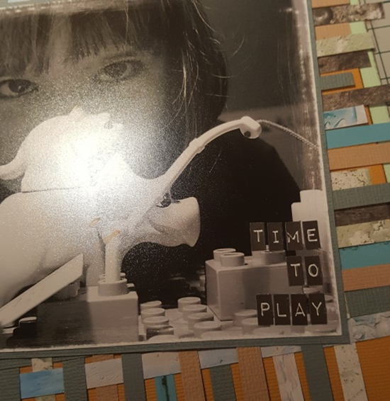 On top of that layer the “Metal Panels” piece and then your photo. I used the outside part of the clock die cut from the embellishment pack and coloured it black, and then slipped it underneath my photo on the left hand side.