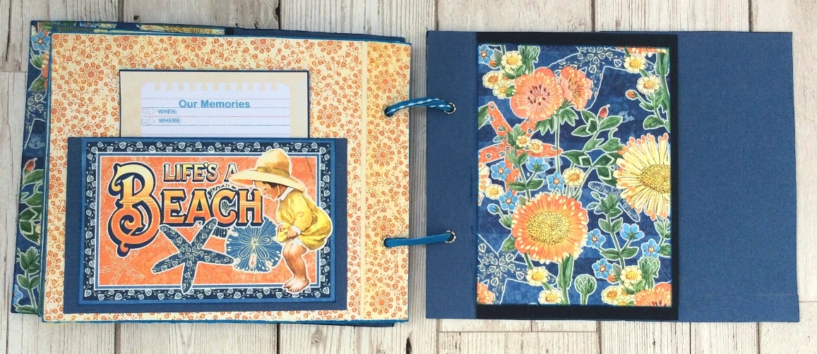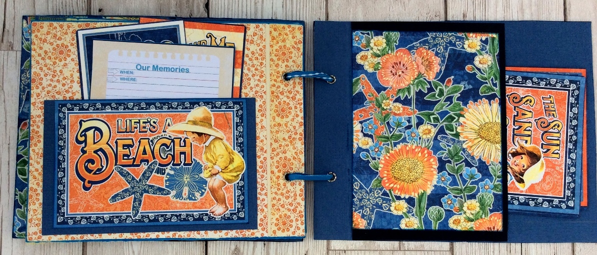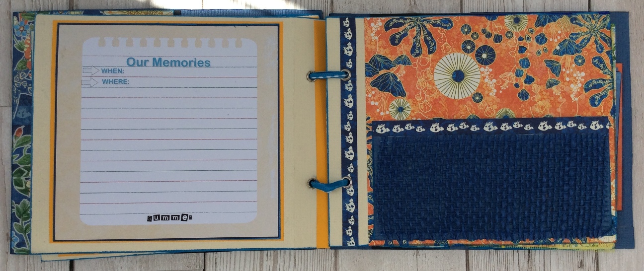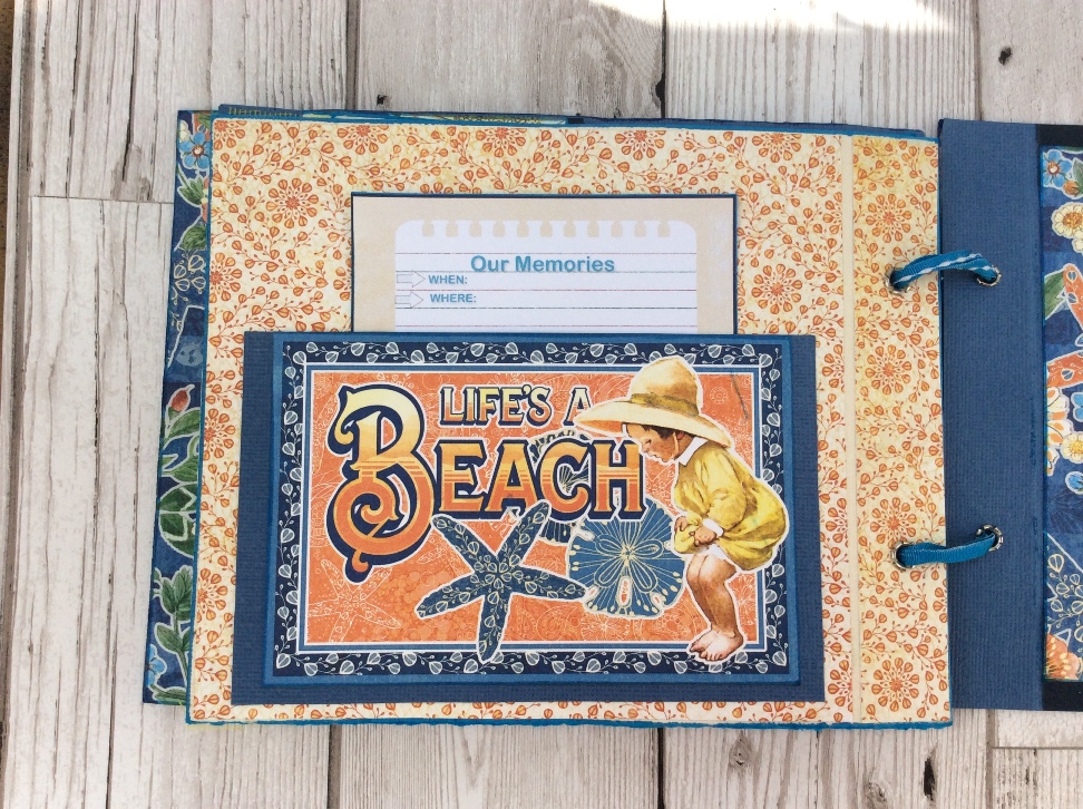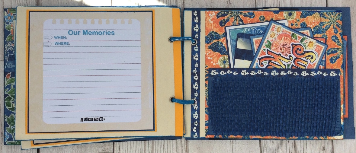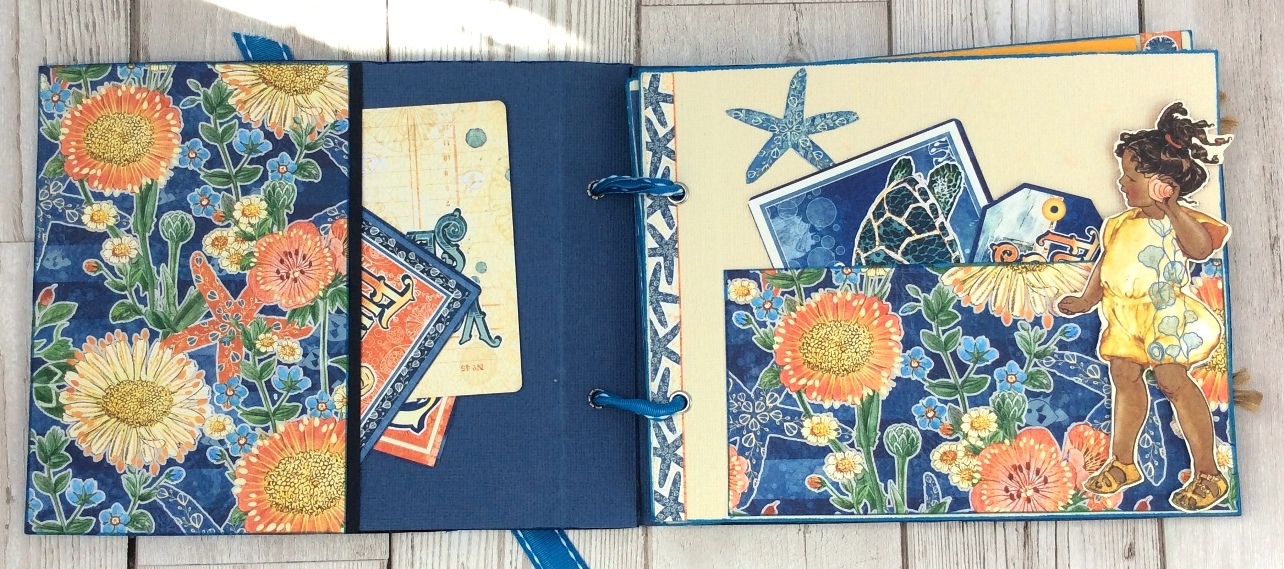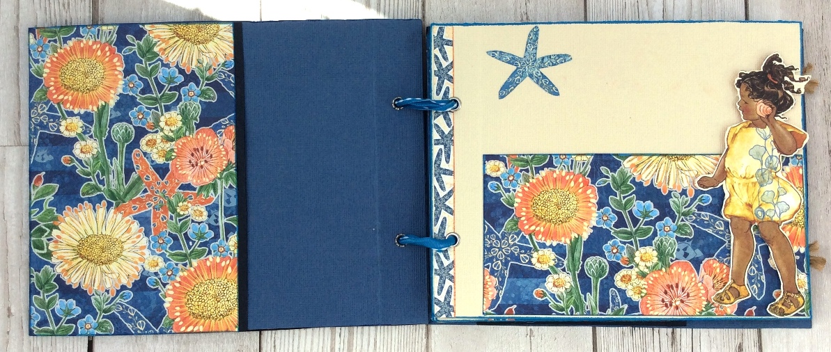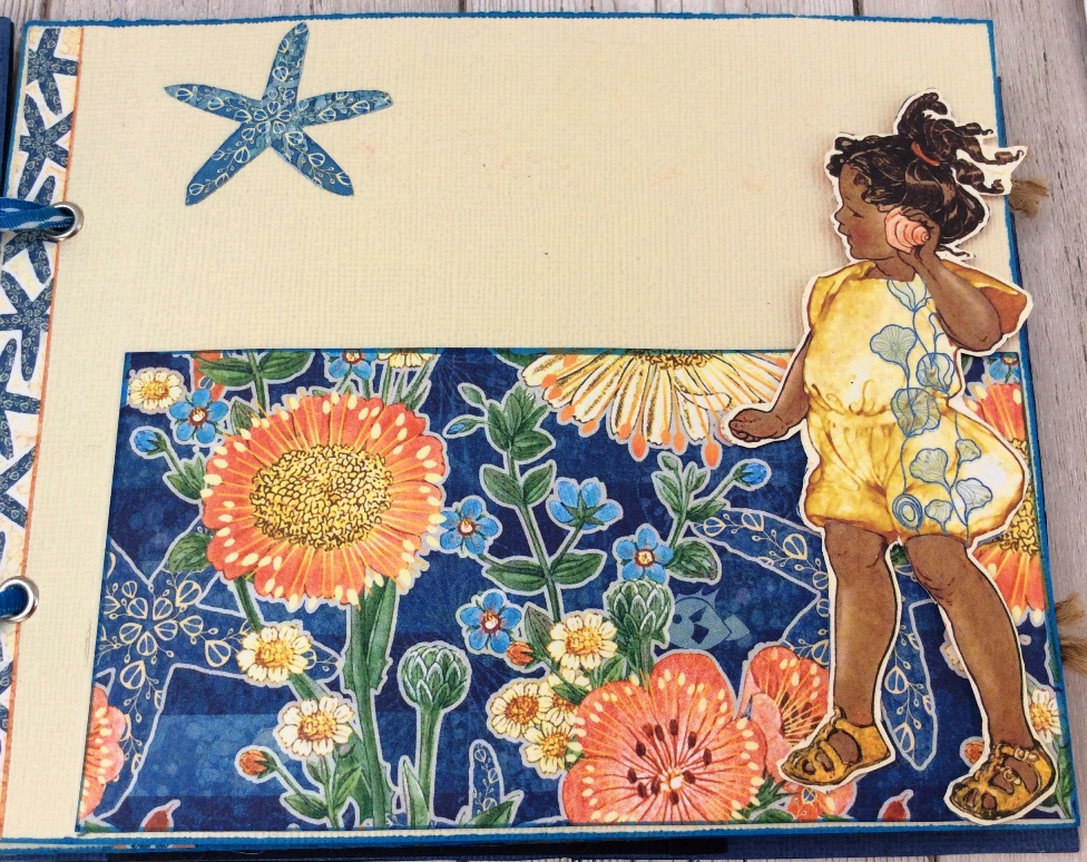 Make a pocket with a piece of "Floating Floral" measuring 6.3" x 3.25". Attach on three sides as before to form a pocket. Attach a girl from the signature page (Sun Kissed) on foam pads, and a blue starfish from "Splish Splash". Add a border on the side from "Kids at PLay". Re-punch holes.