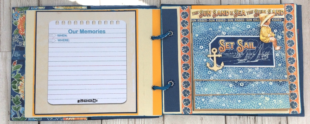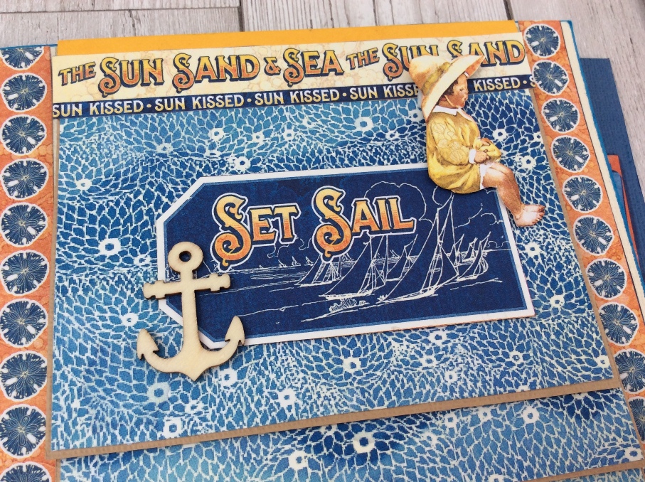 Decorate the front with borders from "Kids at Play", a tag from "Kids at Play", a child cut out from "Splish Splash" and a wooden anchor. I mounted the tag and child on foam tape.