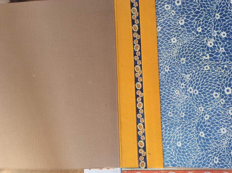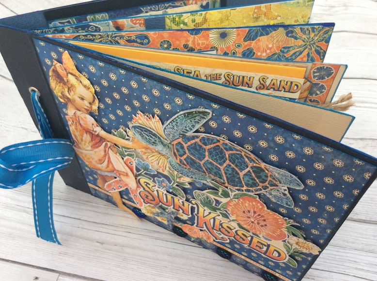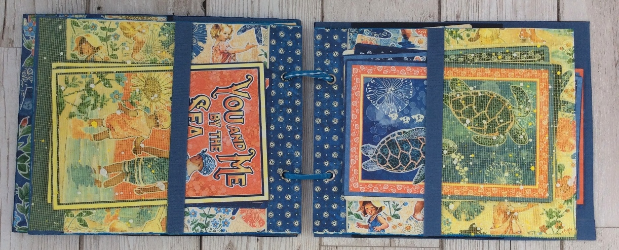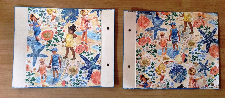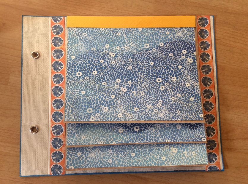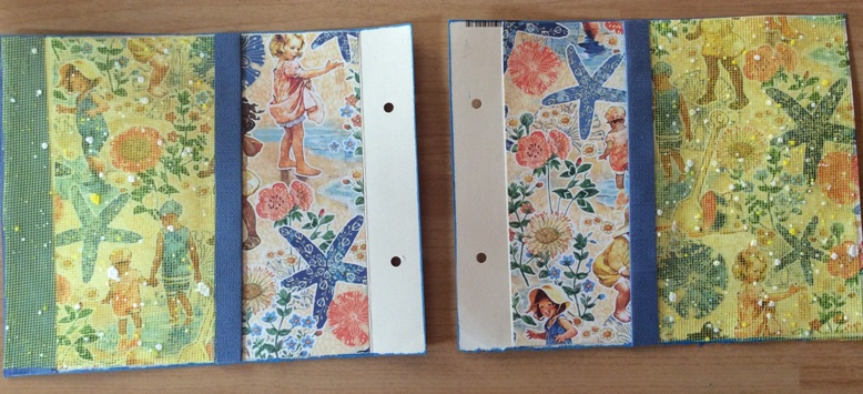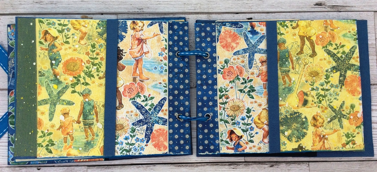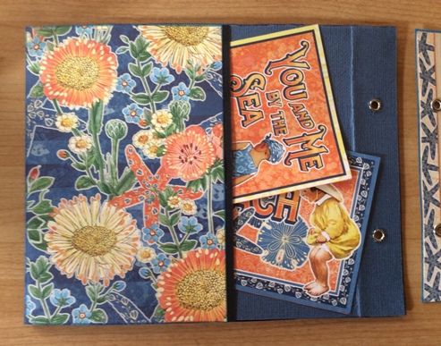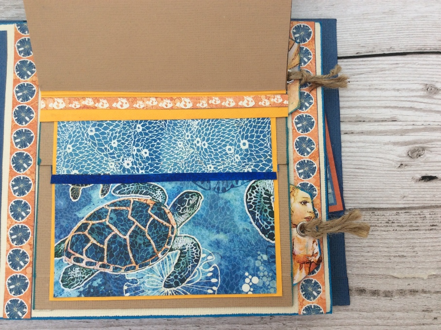 Decorate front with a piece of the blue jute ribbon and the fish border from "Kids at play". Add the fish border to the middle of the edge also. Re-punch holes.