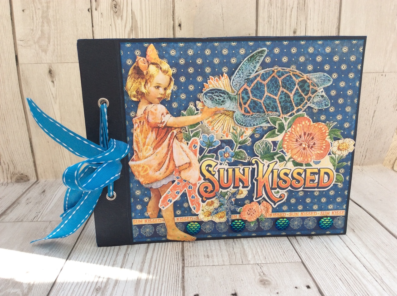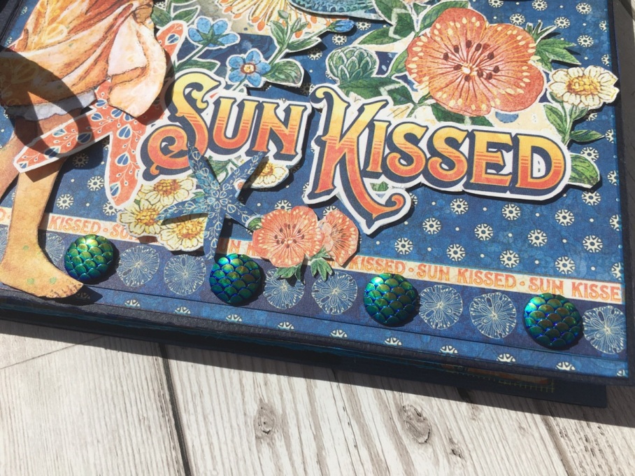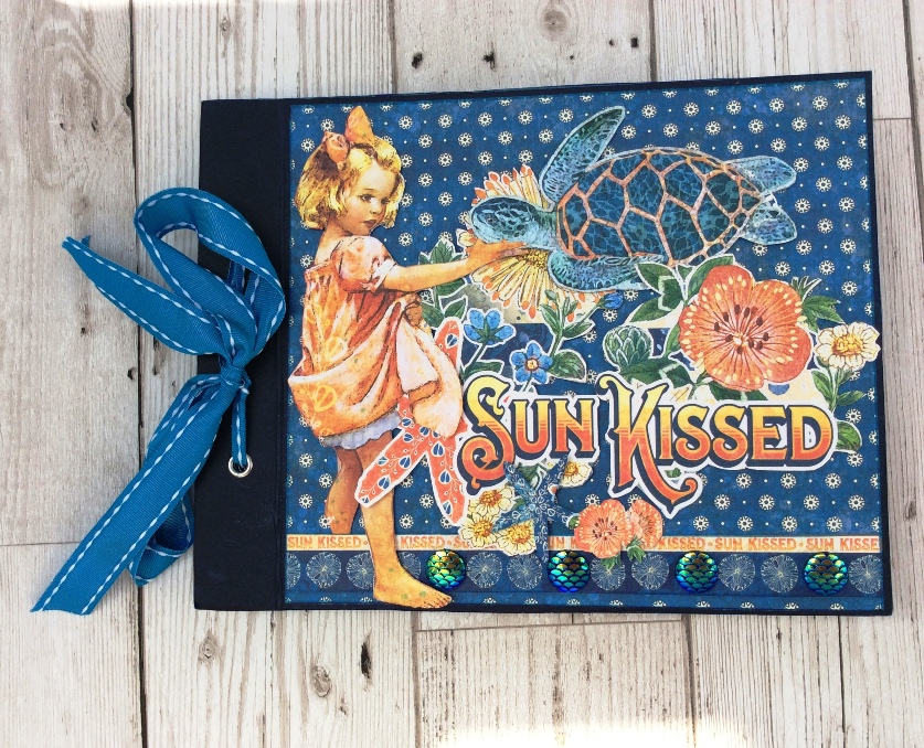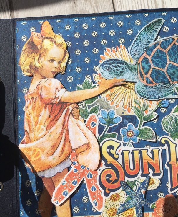 Cover the front of the album with the reverse side of "Sand dollar" Add images cut from the signature page (Sun Kissed) with mounted on foam tape for a 3-D effect. Add a border from "Kids at Play" and four blue Mermaid resin.