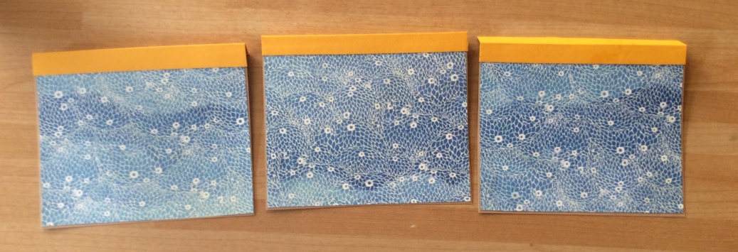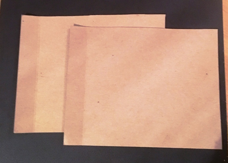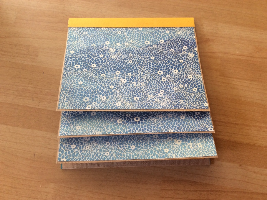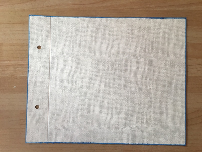 Using "Vanilla" plain cardstock, cut four pages measuring 7.5" (w) x 6" (h). You will have two pieces left over, keep those for the cards (see here). Ink edges with blue ink (optional).