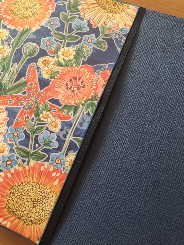 Do the same on the inside back pocket. Here I used the smaller piece of "Floating Floral" measuring 5.6" x 4.3" and added Navy cardstock around the edges for contrast. Again attach with double-sided tape on three sides to form a pocket.
