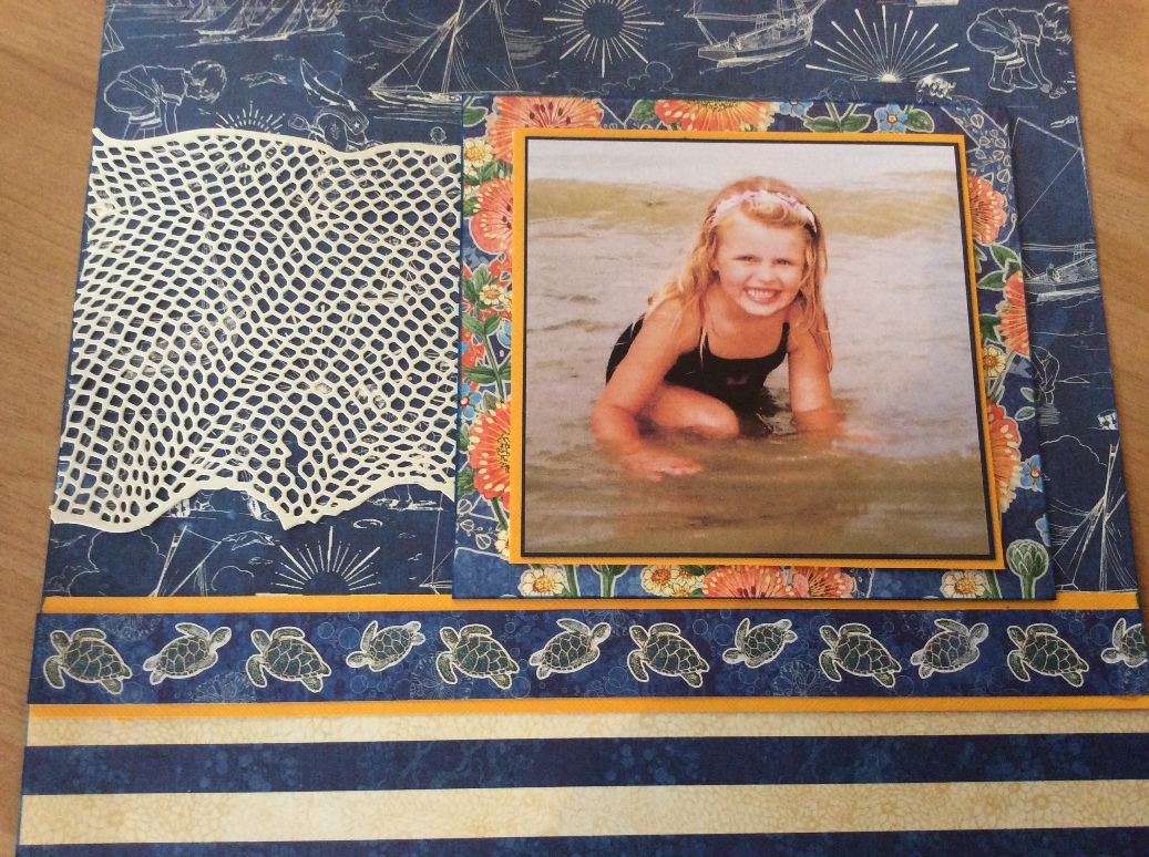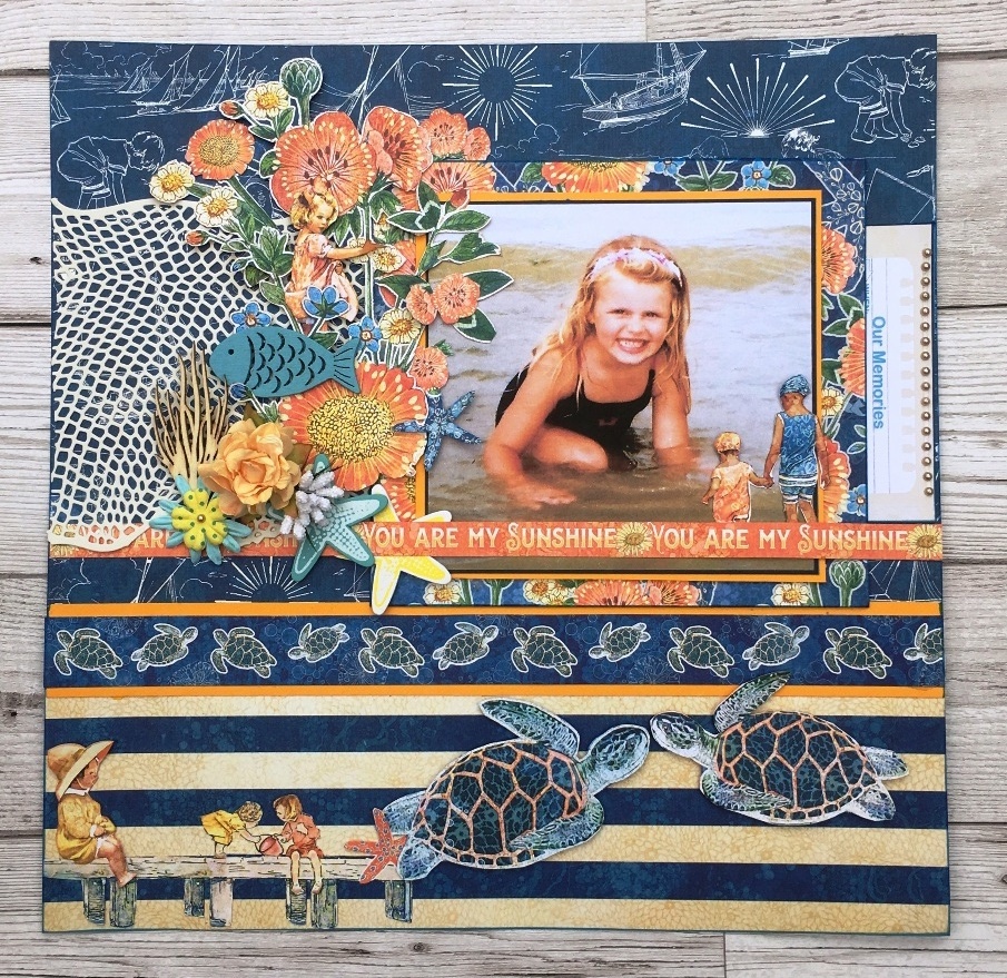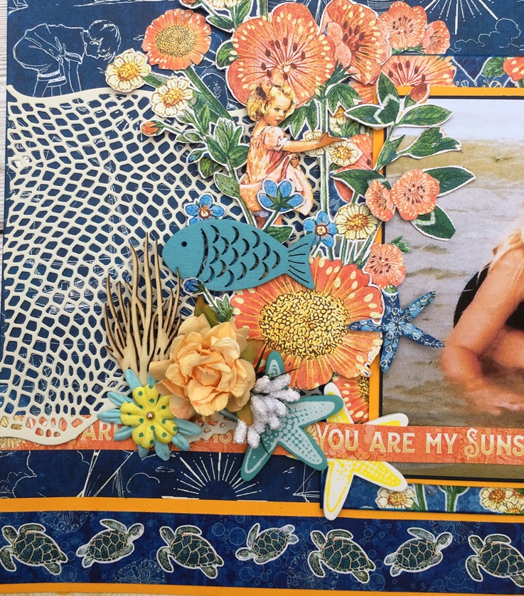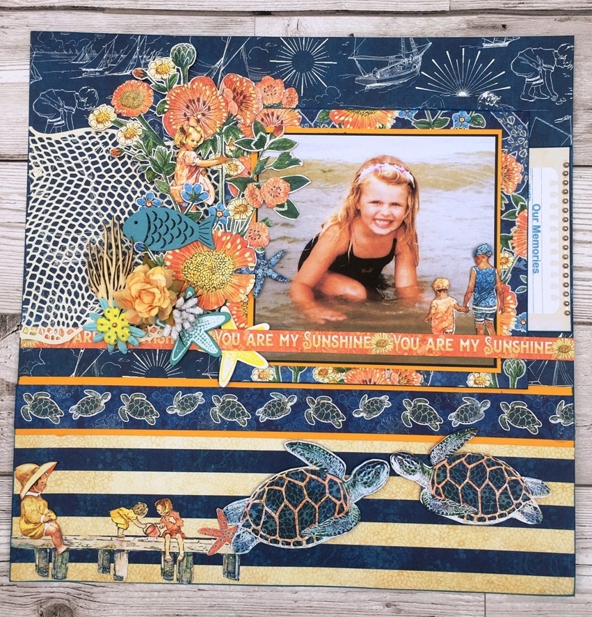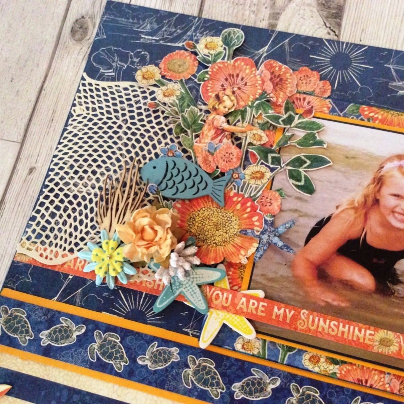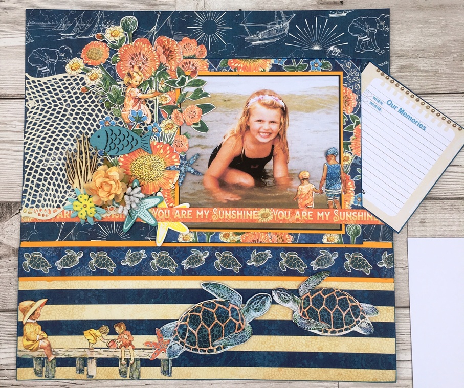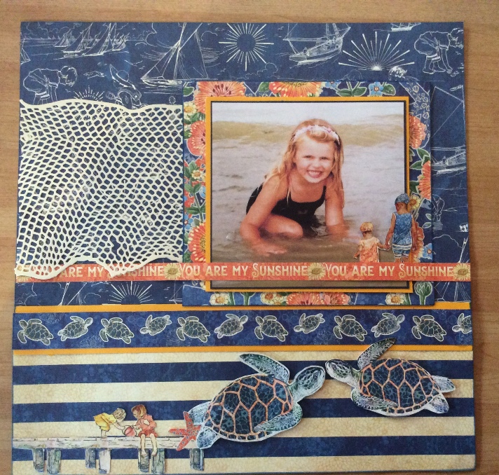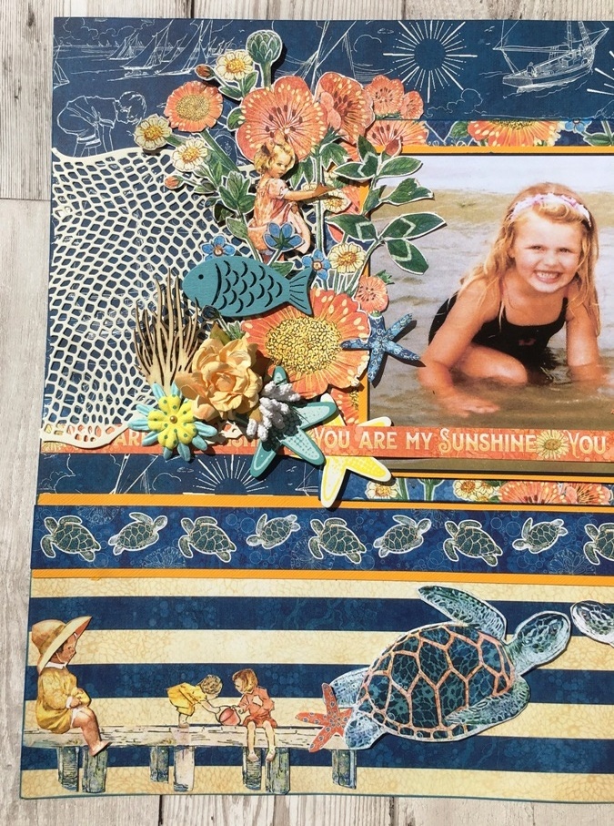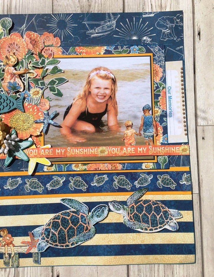 Now for the fun part: embellishing the page. Cut a variety of images out from Turtle Time, Splash Splahs, Floating Floral and Signature Page. Use the fussy cut images and embellish with Kaisercraft Wooden floruishes, blue wooden fish, Wooden starfish, pearls and flowers. Start by embellishing the bottom with a pier cut from "Sunkissed" a little boy from "Splish Splash" and two of the big turtles from "Turtle Time". Add the "You are my Sunshine" border from "Kids at Play" and the two little girls by the picture cut from "Splish Splash". Leave the border unstuck until you know what you are placing below it (see pictures below):