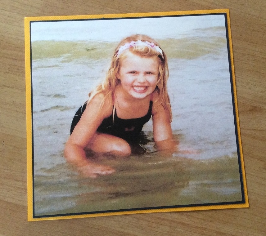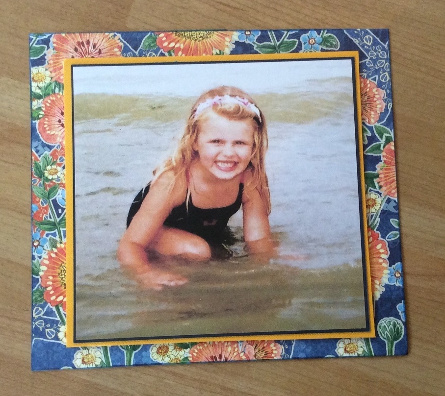 Prepare your photo. I added a dark border in my imaging software, but you can just mat on cardstock if you wish. My picture was then 5.25" x 5.25". Mat on Melon cardstock measuring 5.5" x 5.5"