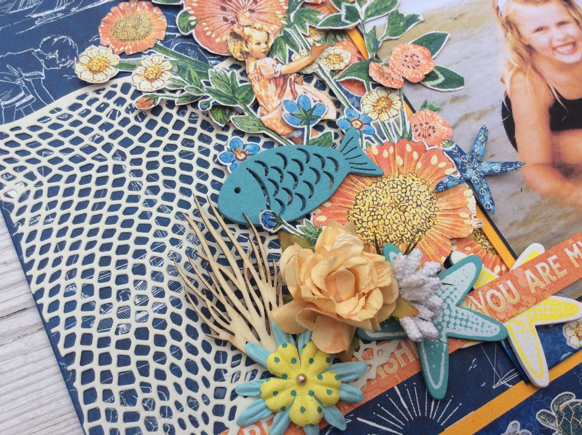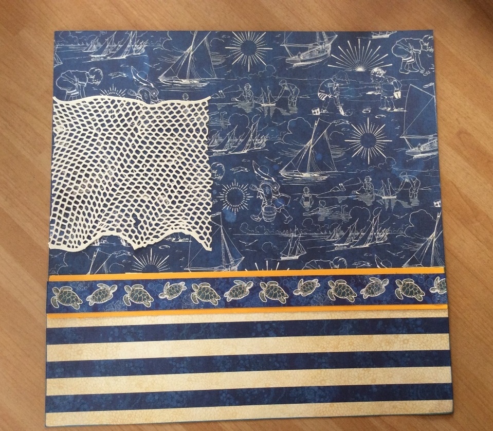 Attach the large fishing net die cut leaving the bottom unstuck in places as we need to include a border later: