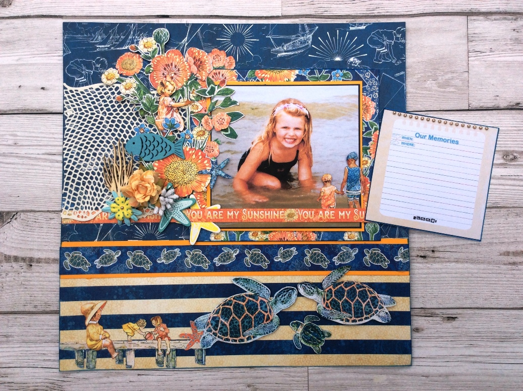 Papers used: "Sail Away", "Splish Splash", "Kids at Play", "Turtle Time", "Floating Floral", "Sunkissed". Plain cardstock: Melon. Embellishments from the kit. Small journal card from the print out.