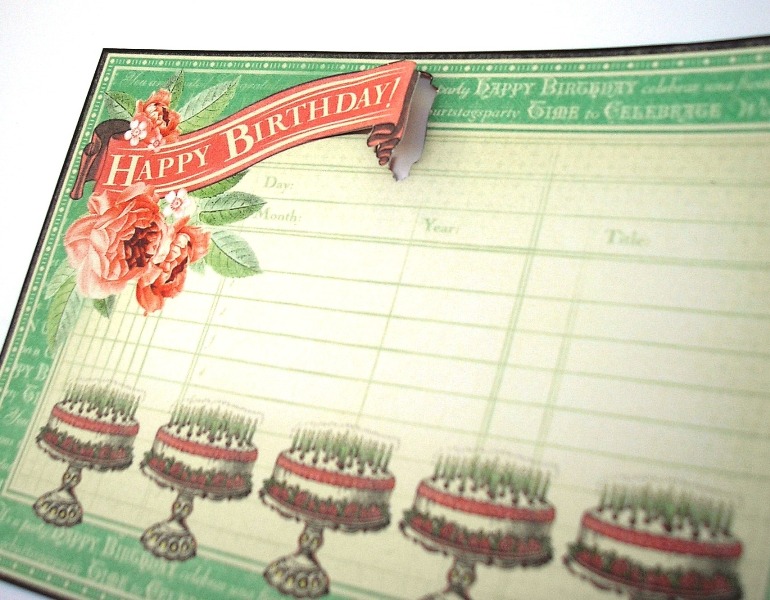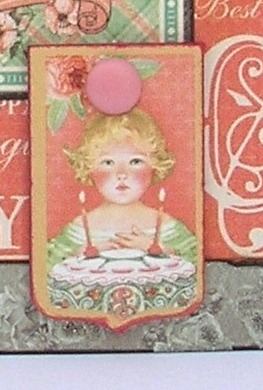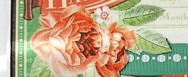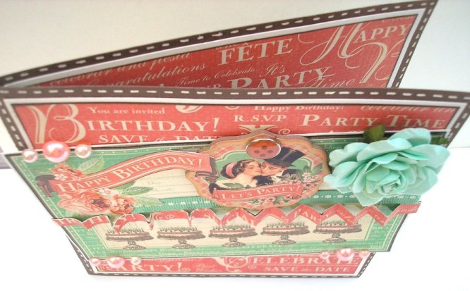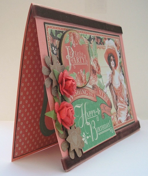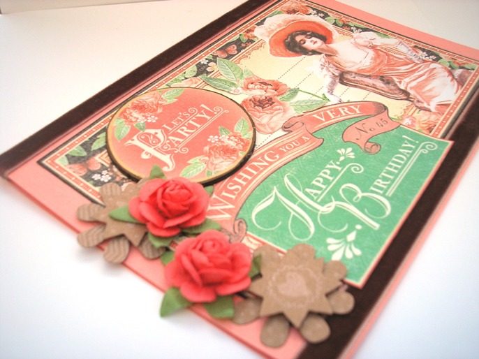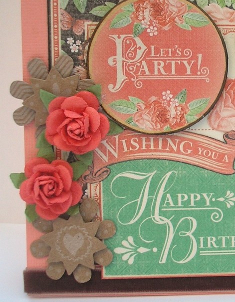 Stick it to the bottom of the card, see pictures for guidance. Add a "Let's Party round piece of chipboard. I inked the edges in brown ink first. Cut a couple of roses out from the "Party Perfect" paper, and stick them next to the chipboard piece. Add a couple of paper roses and K&Co Handmade Layered Accents.