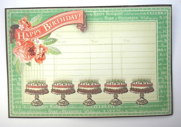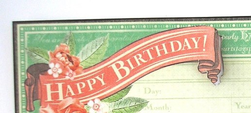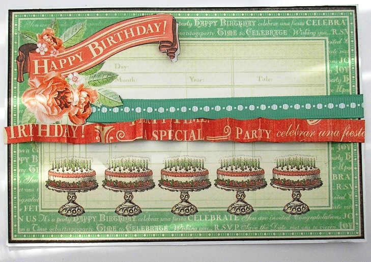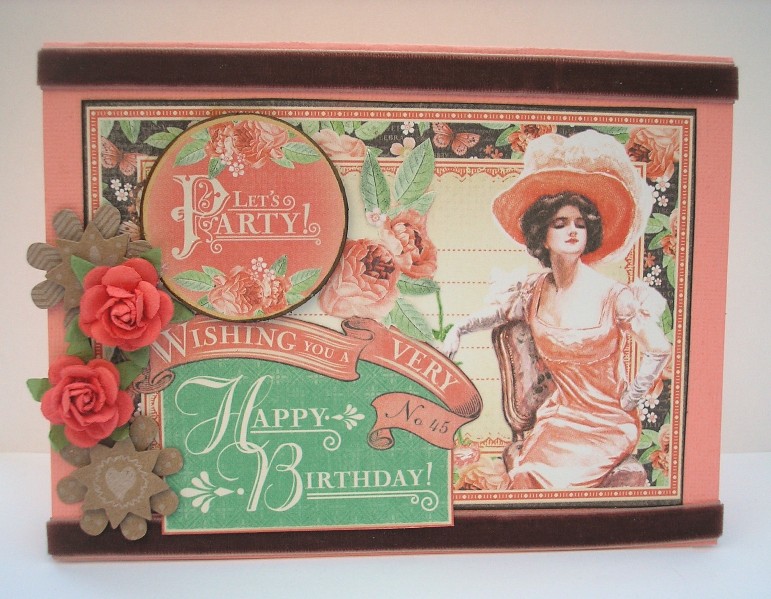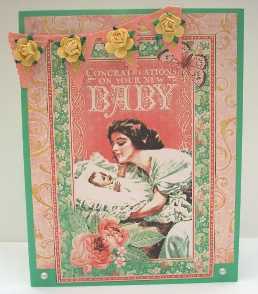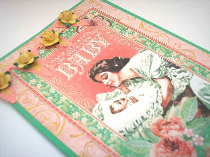 Make a card measuring 17cm x 13cm. Cut a piece of Basic Grey Two Scoops paper, measuring 15cm x 12.5cm, and attach to card (see picture for guidance). Cut out image and glue onto front of card. Cut out banner and top with roses. Ad two pearls.