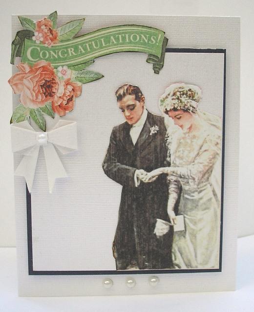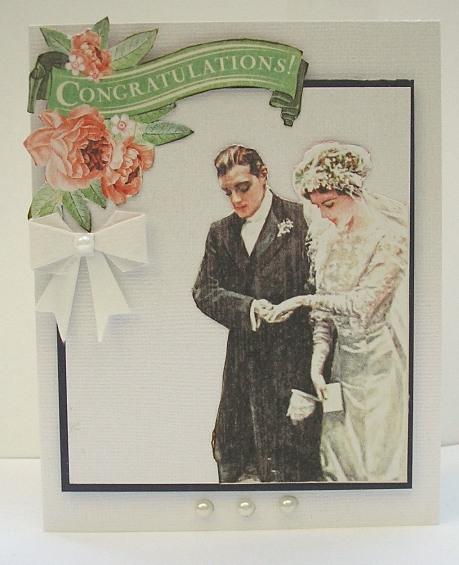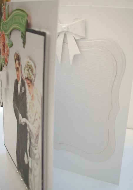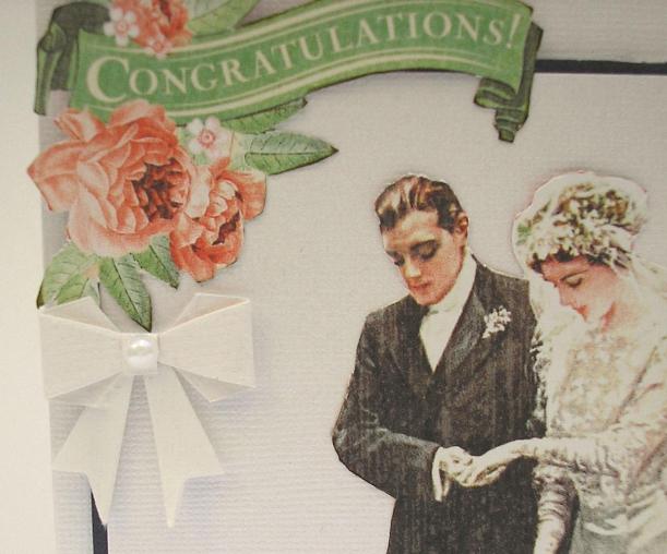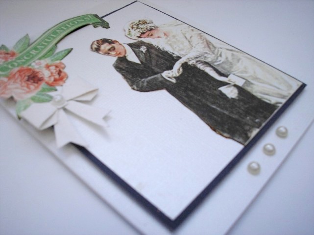 then cut out the bride and groom, and the "Congratulations" with the roses and leaves. Add the bride and groom to one corner of the mounted, layered cardstock (see pictures for guidance). Add the "Congratulations" floral piece to another corner. Add a little foam tape at the top where it meets the main card. Add a white paper bow, and three white pearls at the bottom.