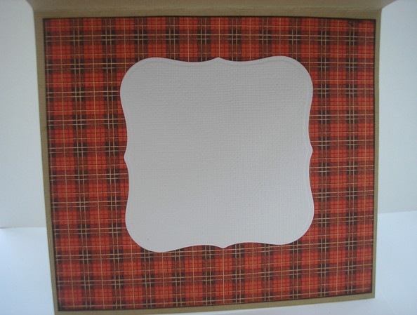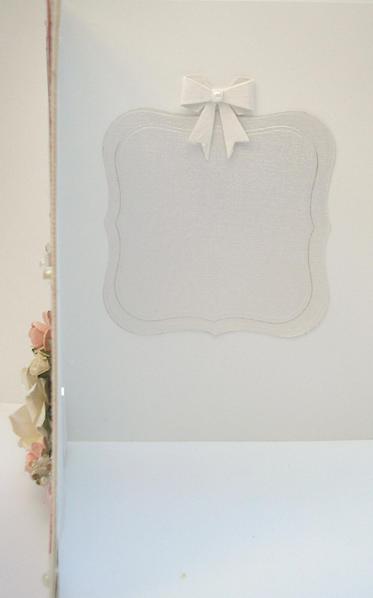 Add the piece you cut earlier to the inside. I added a cut-out, using a spellbinders die, to take my sentiment. You could embellish further by adding a doily below this and a piece of lace at the bottom to emulate the front: