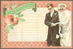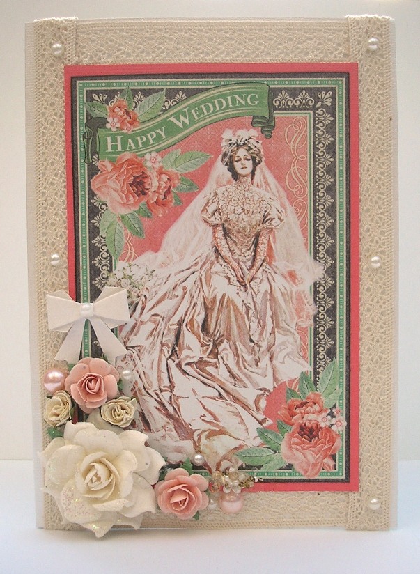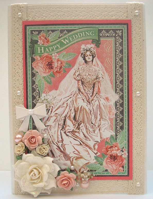 Many manufacturers these days include a few sheets of picture panels in their 12x12 collections, perfect for card makers - great for scrappers too of course, but they really come into their own when used on cards. I used a fabulous image from the "Congratulations" paper in the G45 "Time to Celebrate" collection. This panel measures 15.5cm x 10cm, so lends itself perfectly to a beautiful large card. Cut a piece of cardstock measuring 19cm x 28cm, and fold it into a card measuring 19cm x 14cm (7.6" x 5.5"). I used a pearlescent piece of card. Attach strips of lace on all edges - I stuck on two strips top and bottom with double-sided tape, then added the two longer pieces and wrapped them over the edge of the card.. My lace here measures 15mm in width. I used lace from the Santoro Mirabelle pack. Cut out the large "Happy Wedding" bride piece from the "Congratulations" sheet. Mount on coordinating cardstock slightly larger than the cut-out. Add an ensemble of roses in one of the corners. I used a large Prima flowers, plus smaller paper roses. Add pearls to the corner, and along the sides on top of the lace. Top with a white paper bow. I also added a stick pin.