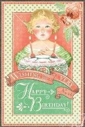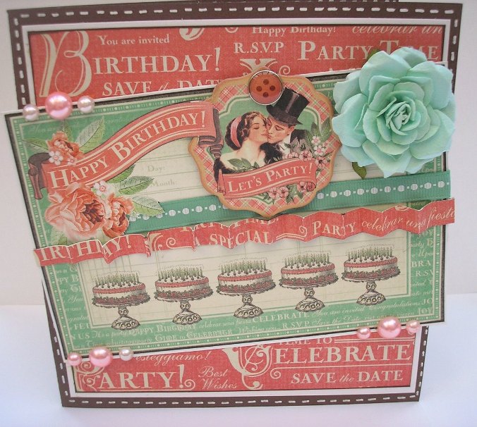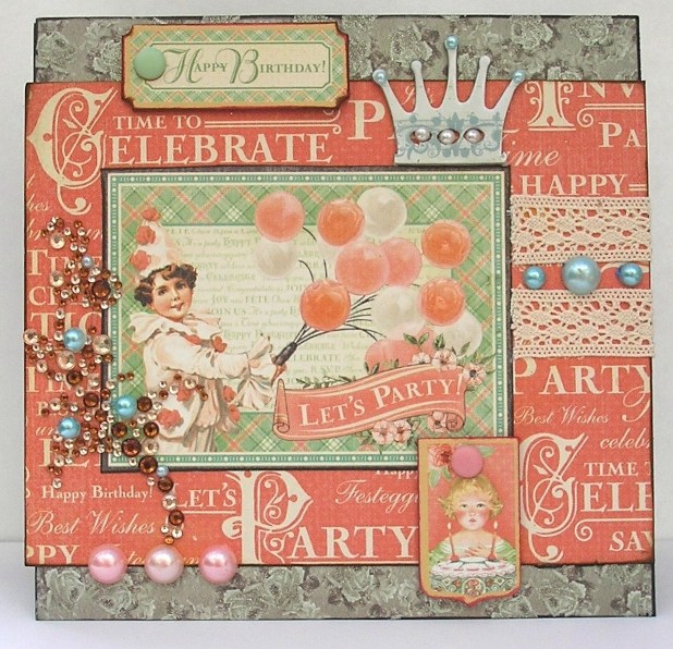 Cut a piece of plain cardstock for a card to measure 6" x 6" Cover the front with a glittered piece of paper from the Mirabelle 6x6 pad. Ink edges. Cover the inside with another sheet of the Mirabelle Glittered Rose paper. Cut a piece of the "Make a Wish" paper slightly wider than the card. Ink edges with brown ink. Stick onto front of card. Cut an image out of the "You're Invited" paper. Stick onto front (see pictures) Add two strips of lace next to the image on the right-hand-side (see pictures) Add a Prima Crystal swirl, and a few pearl on the swirl itself (see pictures) Ink the edges of two "Let's Celebrate" Chipboard Tags and attach them with plain Basic Grey brads: