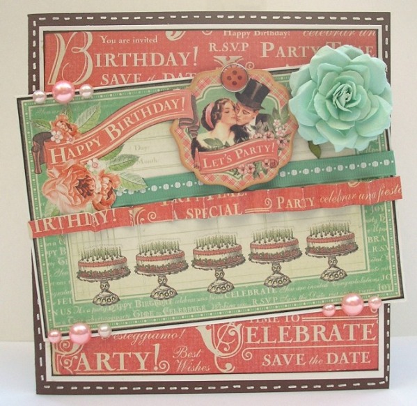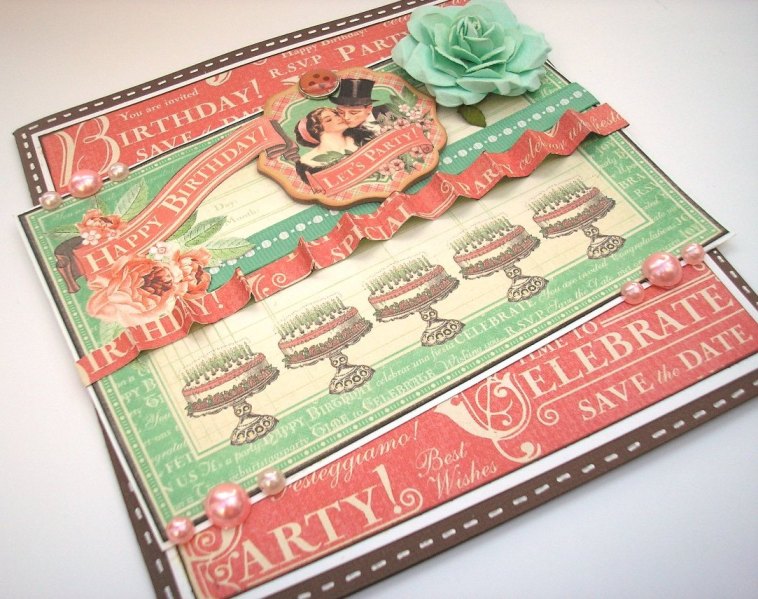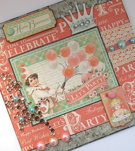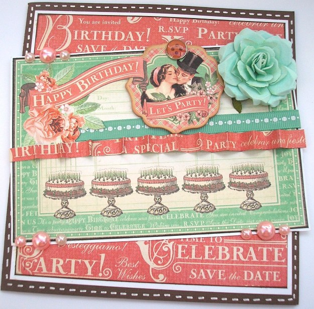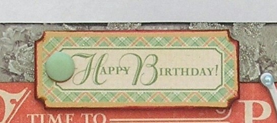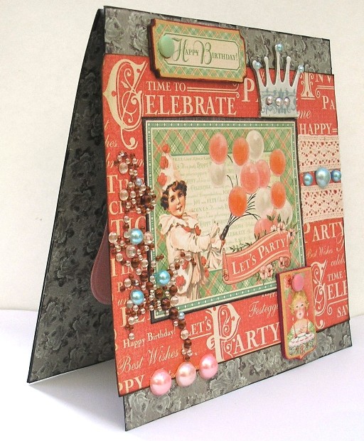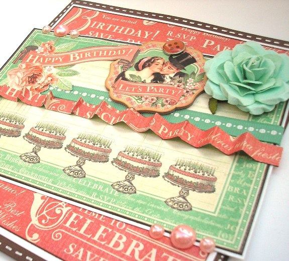 Attach a "Let's Party" Chipboard piece from the "Time to Celebrate" chipboard pack to the top, below the cut banner; attach a Basic Grey Glazed Brad to the chipboard tag. Putting the piece at an angle, glue onto front of card, and push the legs of the brad through to the main card. Add pearls and a large Prima flower.
