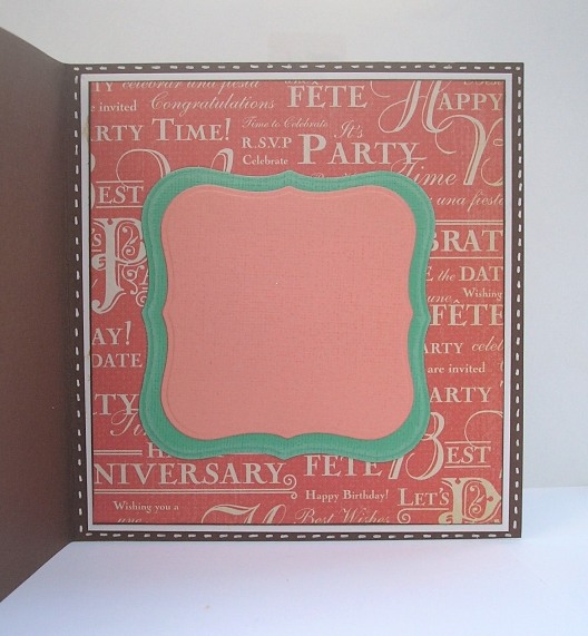 Decorate the inside with the reverse side of "Party Perfect" (I inked edges with brown ink). It would look lovely if you cut more roses out to decorate around the middle here. I ran out of time, but will do this before using it:
