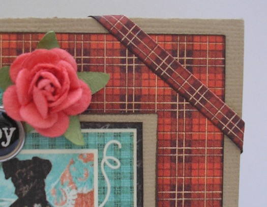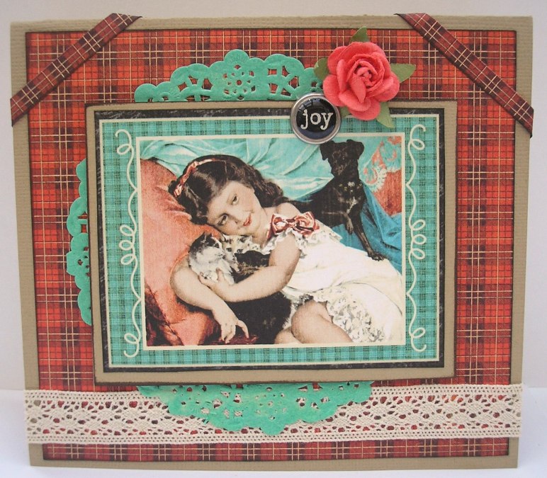 Cut a piece of cardstock into a card size 13.5cm x 15cm (wide). Cut a piece measuring 14.5cm (width) x 13cm from the main "Raining Cats & Dog" paper. We are using the reverse here. Ink edges. Cut another identical piece for the inside. Stick the paper to the front of the card. Cut a piece of the remainder, ink edges, then fold them over the top edges. add a strip of lace to the bottom (see pictures) Add a small doily to the front of the card, slightly off centre. I couldn't see the exact colour I wanted, so coloured over the green with an Aqua colour to match the picture. You only need to colour what you can see. Cut the image we are using out of the "Well Bred" paper. If you look for it in the shop, you wont see the image as it is under the folded corner. Just trust me that it's "Well Bred" :) Mount it onto the same cardstock as you main card. Ink edges with brown ink Using foam tape/pads to elevate the piece, mount the centrepiece to the middle, on top of the doily. Add a rose and a sentiment. I used a K&Co piece I had (sorry, sold out in the shop). A lovely glazed brad would be nice here too.