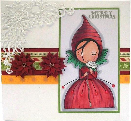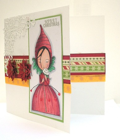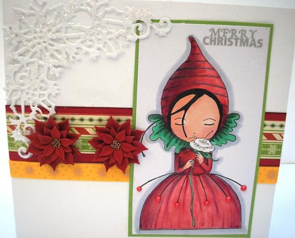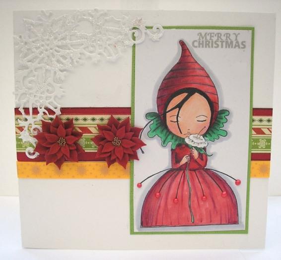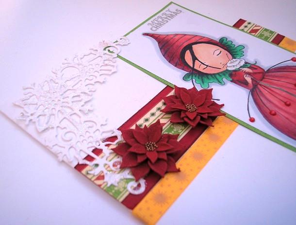 Stick your main image onto the card (see pictures for guidance). Cut a large corner and stick it onto the card. Add glitter there and there to the corner die-cut, and also on the little flower on the stamped image. Add two large poinsettia.