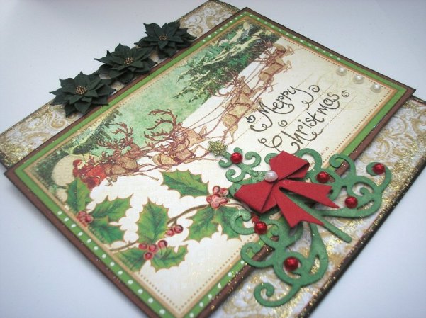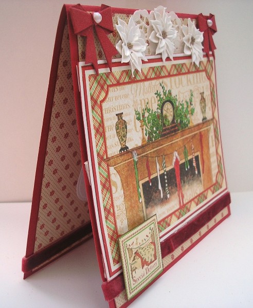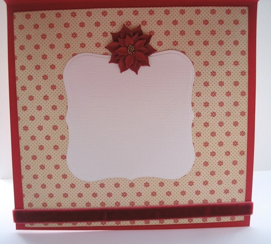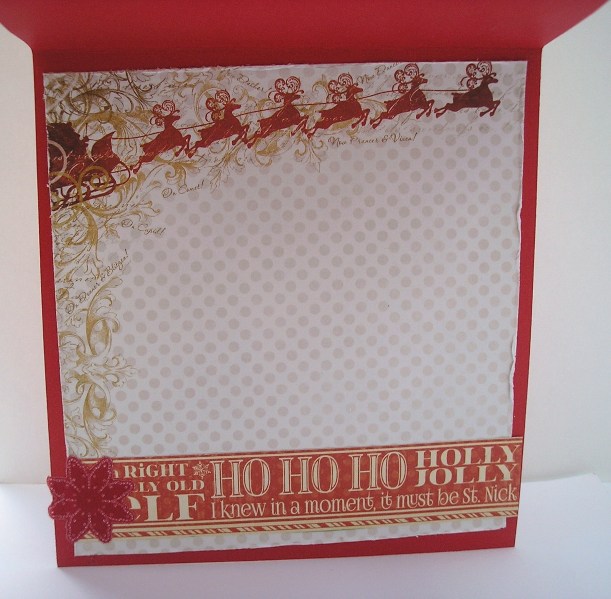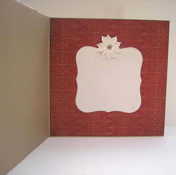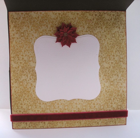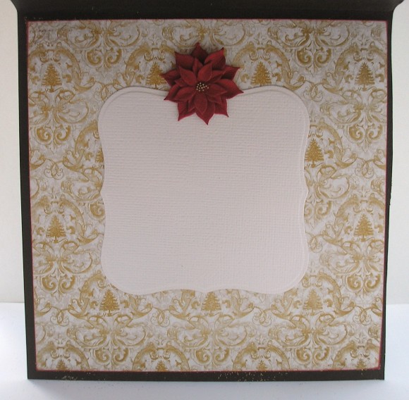 Cover the inside with the Silver & Gold paper, ink edges with red distress ink. Add a white panel to take your sentiment. I used a Spellbinder die. Top with a red poinsettia.