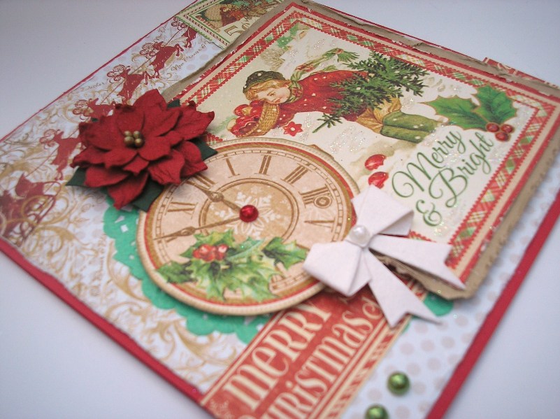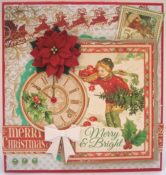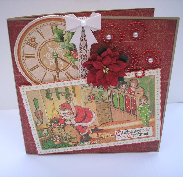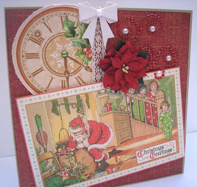 Cut and fold a piece of plain cardstock into size 15cm x 15cm Cover inside and out with Silver & Gold paper. Ink edges before sticking down. Cut a large clock from the Jolly Old Elf paper. Rough up edges with a distresser, I used the Tim Holtz Paper Distresser. Stick it onto left-hand corner, so that it is sticking outside the edges of the card at the top (see pictures for guidance). Add a strip of lace right-hand side of clock and top with a white Bow with Pearl. Cut out the image from the "Long Winter's Nap" paper. Mount on foam pads, then attach to card at an angle (see pictures for guidance) Add a Prima Swirl and arrange some white pearls in the swirl. Add one green pearl in the middle of the clock by the hands. Finally add a large poinsettia and a little glitter to Santa (on the fur of his clothes)