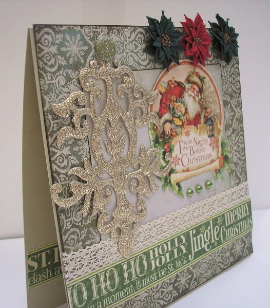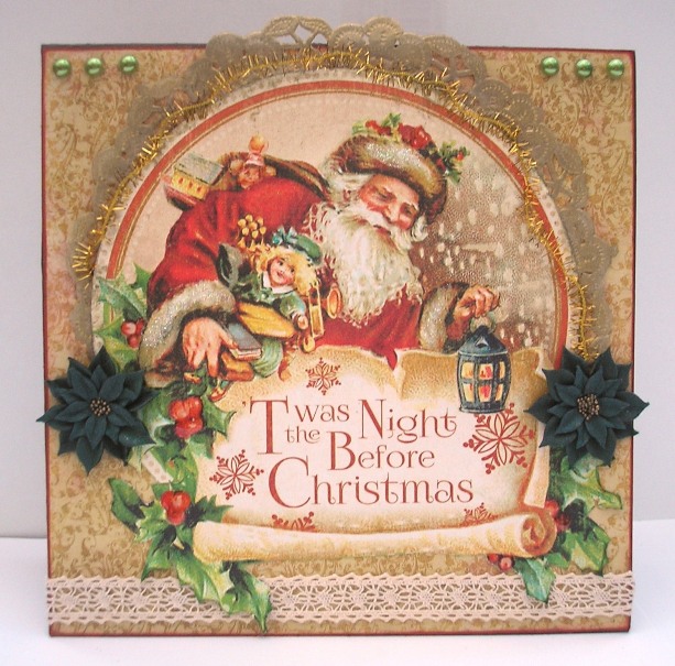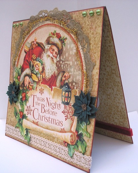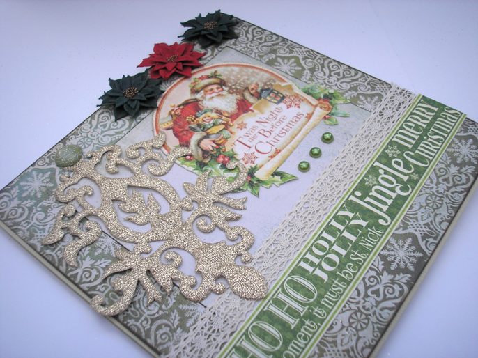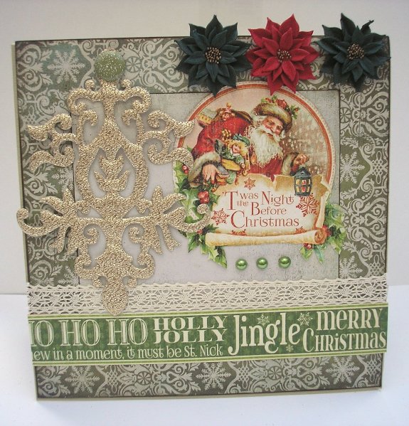 I used: Graphic 45 Twas the Night Before Christmas "Jolly Old Elf" Paper Bo Bunny Silver & Gold 6" x 6" paper Pad Cream Lace Velvet Ribbon Green and red Poinsettia Little gold fibre crystal Stickles