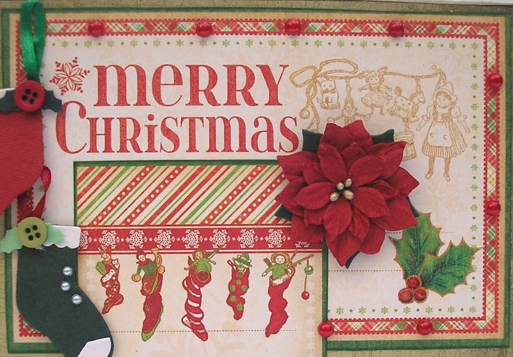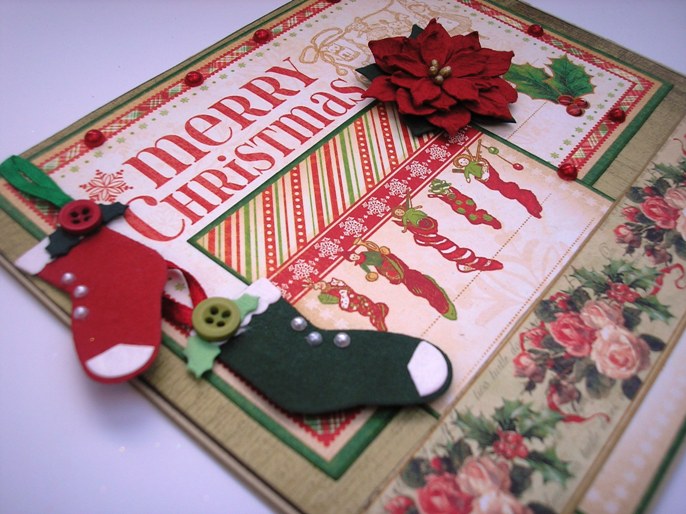 Add two felt stocking, a poinsettia, and some red pearls. I also used Glossy Accents on the berries on the holly image.